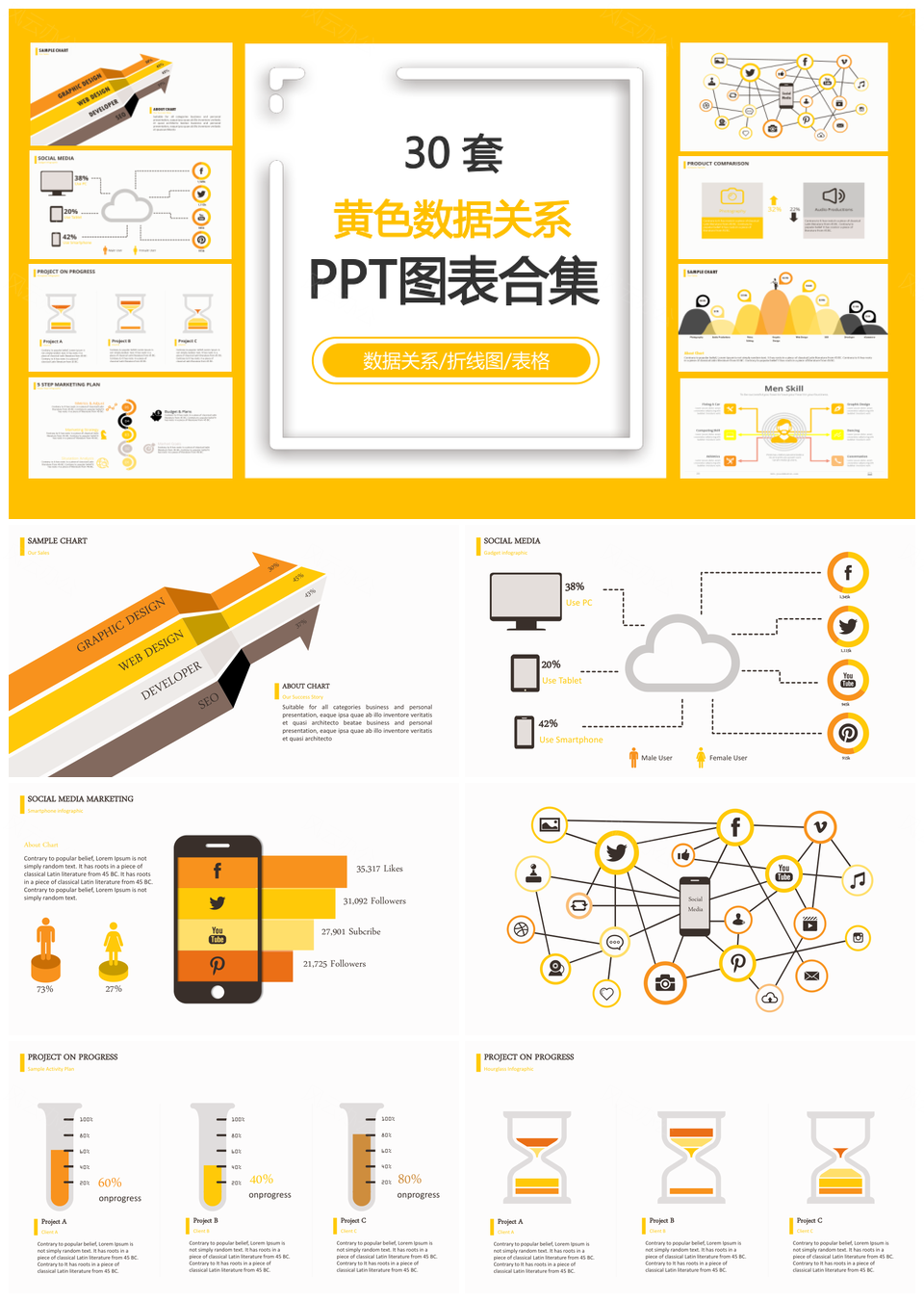 风云办公提供的黄色数据关系数据关系折线图表格PPT图表合集,下载格式为pptx,一共31页,作品中文字及图均可以修改和编辑,图片更改请在作品中右键图片并更换,文字修改请直接点击文字进行修改。
