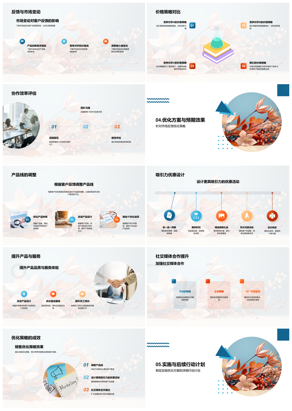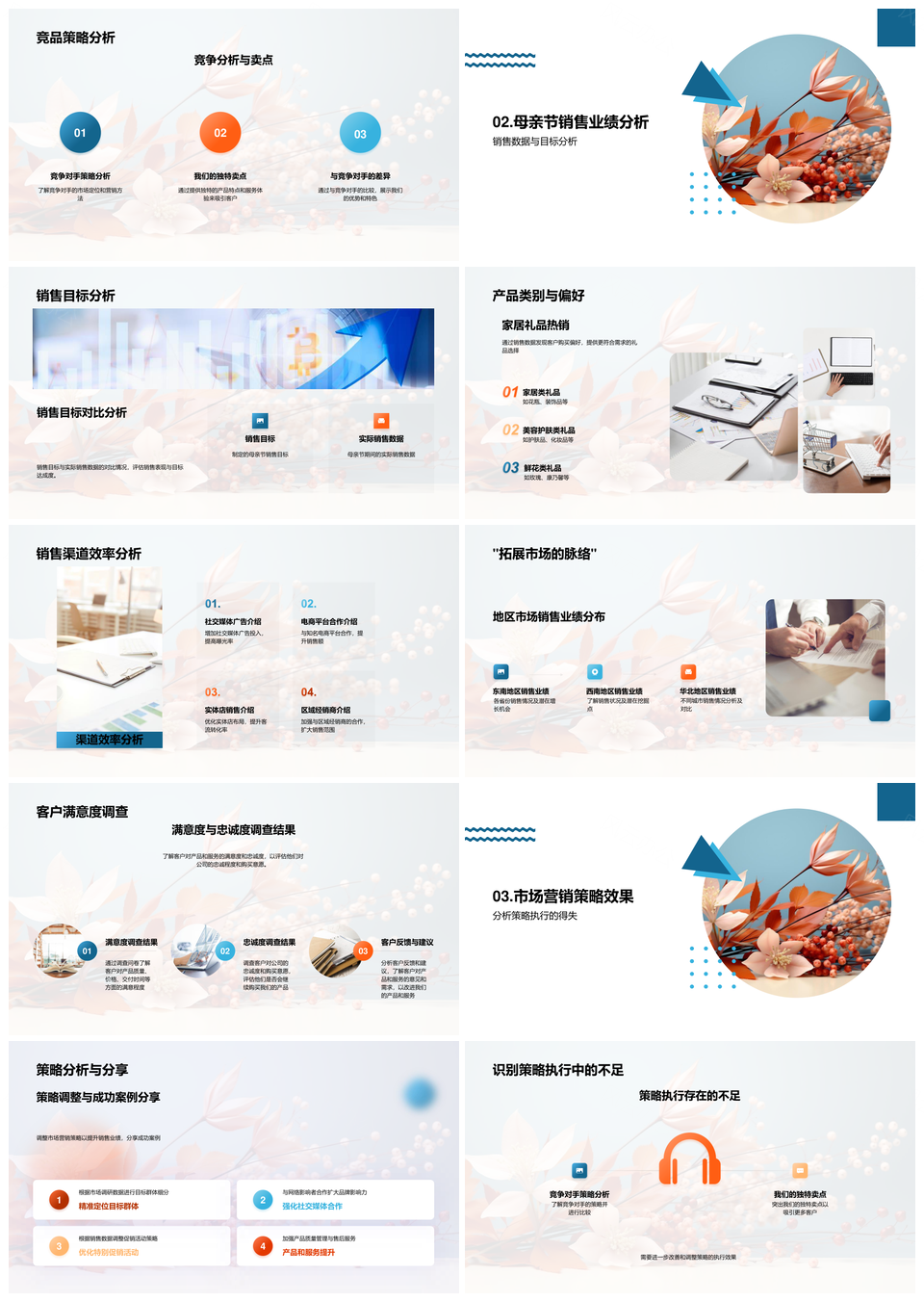 这是一张母亲节销售优化策略执行不足与花束产品线调整PPT模板,包含母亲节、销售、优化、策略、执行、不足、花束、产品线、调整等主题内容,也可用作母亲节销售优化策略、销售优化策略执行不足、优化策略执行不足花束、花束产品线调整策略、母亲节销售优化执行、策略执行不足花束产品线、花束产品线调整执行、销售优化策略执行、优化策略执行不足、策略执行不足花束、花束产品线调整、母亲节销售优化、销售优化策略、优化策略执行、策略执行不足等PPT场景使用。 风云办公提供的母亲节销售优化策略执行不足与花束产品线调整PPT模板,下载格式为pptx,一共33页,作品中文字及图均可以修改和编辑,图片更改请在作品中右键图片并更换,文字修改请直接点击文字进行修改。