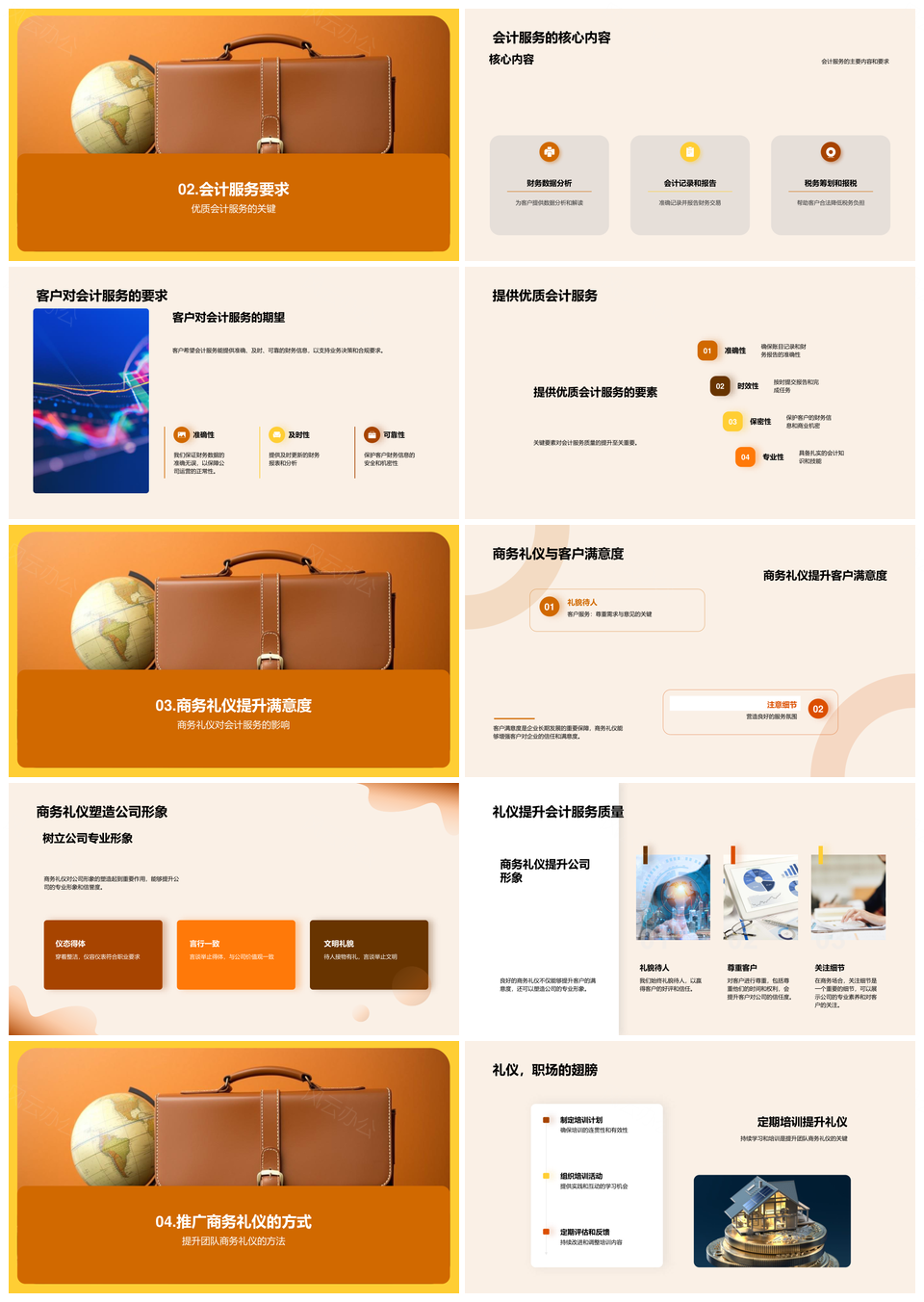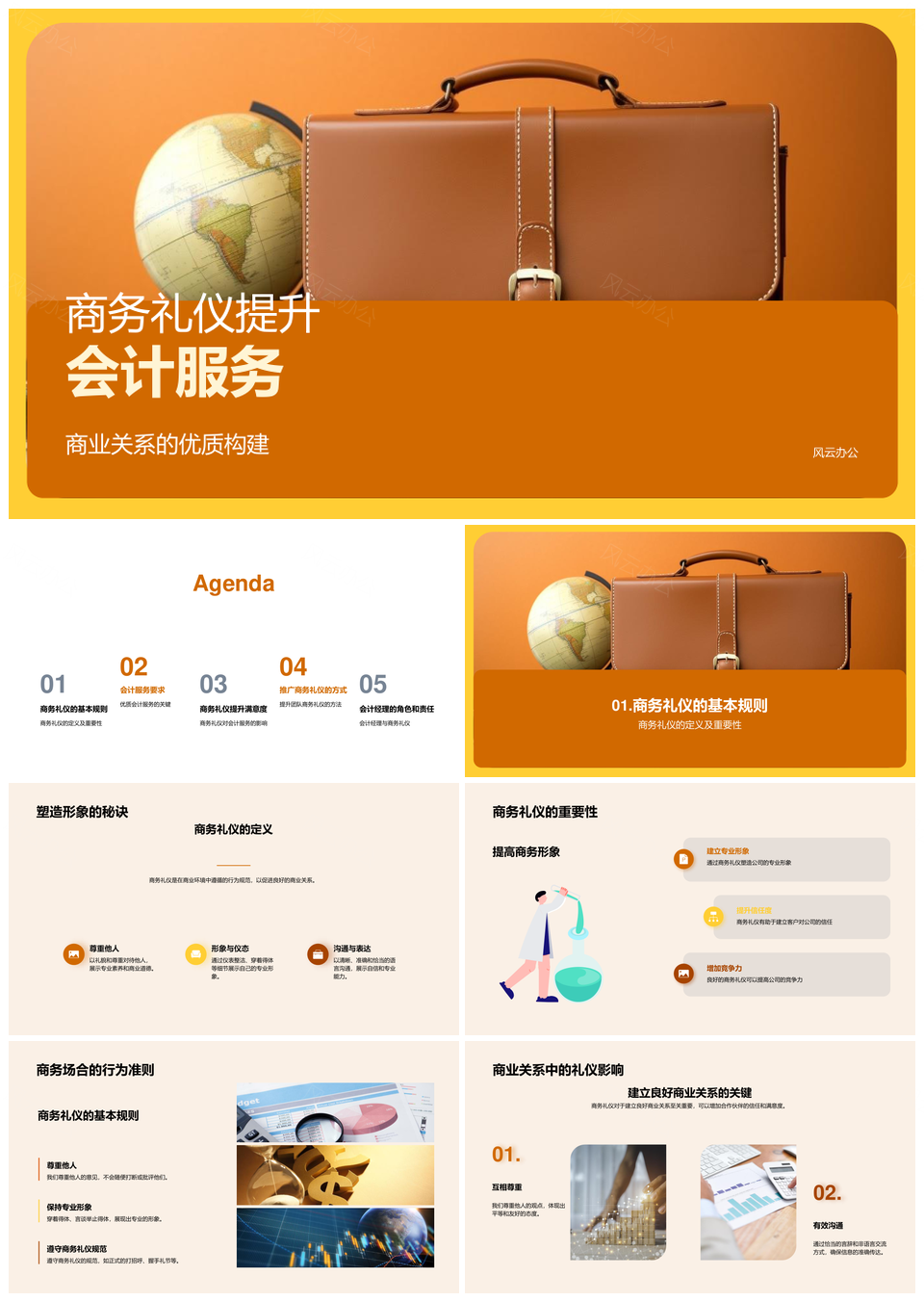 风云办公提供的商务礼仪助力会计服务提升客户满意度PPT模板,下载格式为pptx,一共24页,作品中文字及图均可以修改和编辑,图片更改请在作品中右键图片并更换,文字修改请直接点击文字进行修改。