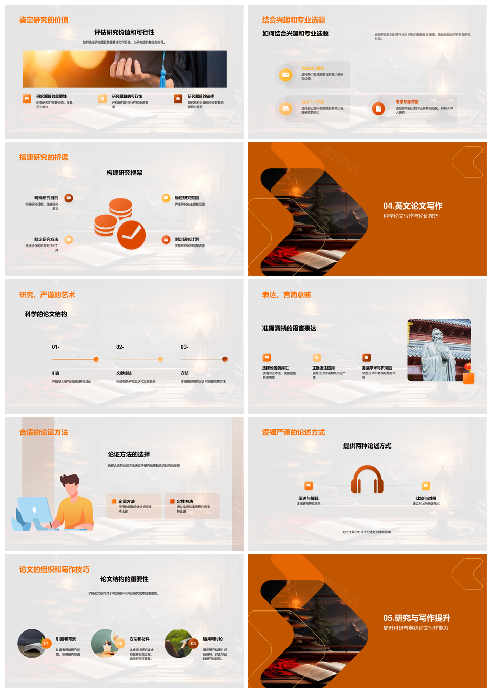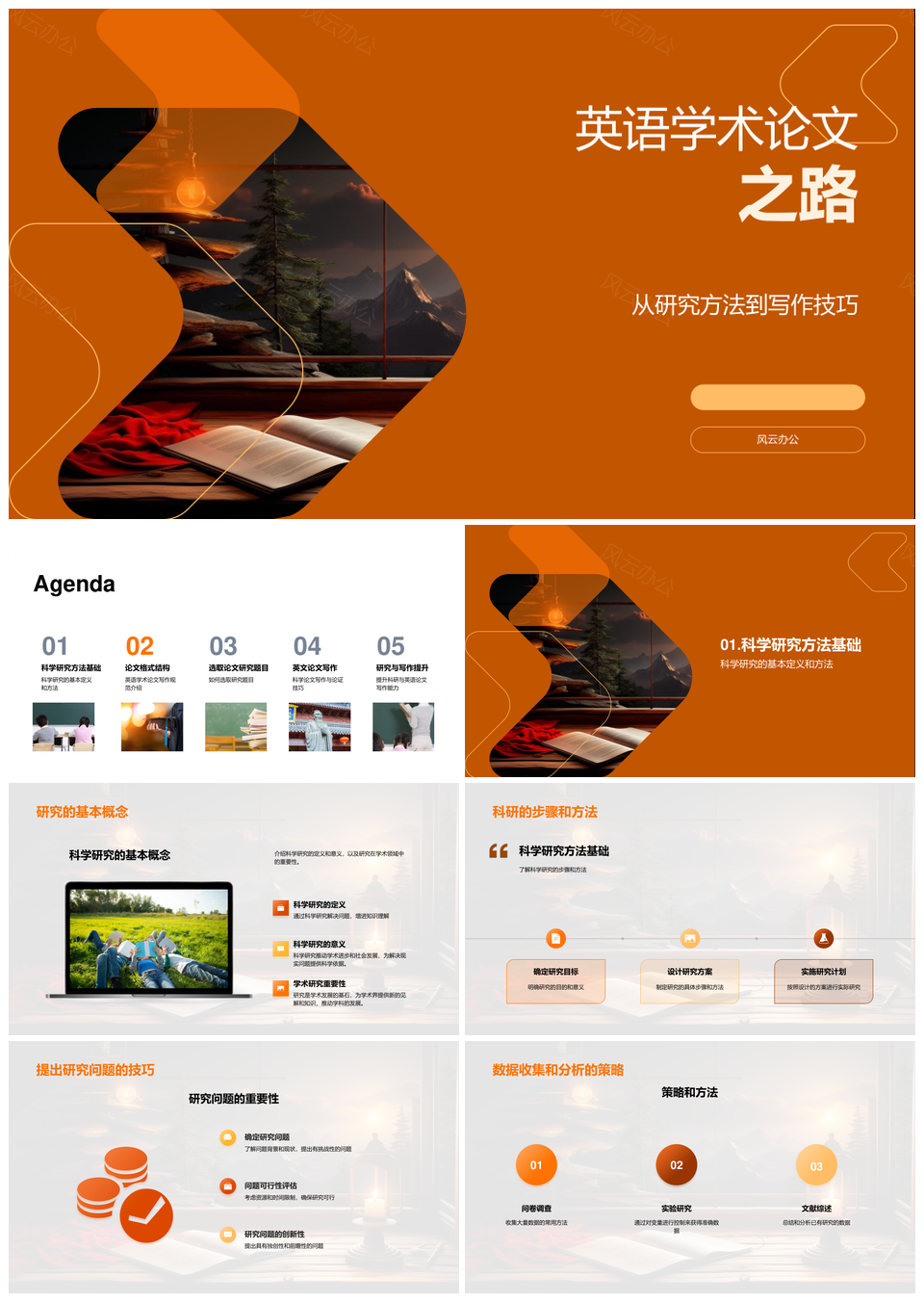 风云办公提供的英语学术论文研究方法与结构逻辑指南PPT模板,下载格式为pptx,一共33页,作品中文字及图均可以修改和编辑,图片更改请在作品中右键图片并更换,文字修改请直接点击文字进行修改。