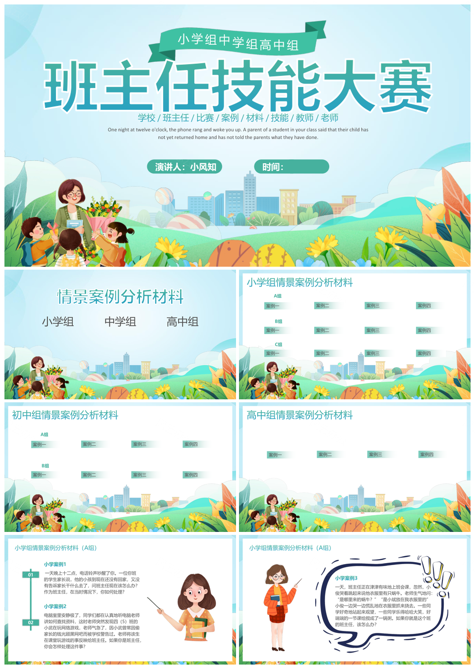 风云办公提供的清新卡通班主任技能大赛案例培训材料PPT模板,下载格式为pptx,一共22页,作品中文字及图均可以修改和编辑,图片更改请在作品中右键图片并更换,文字修改请直接点击文字进行修改。