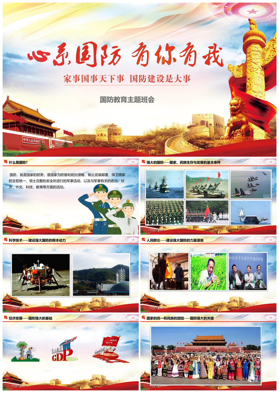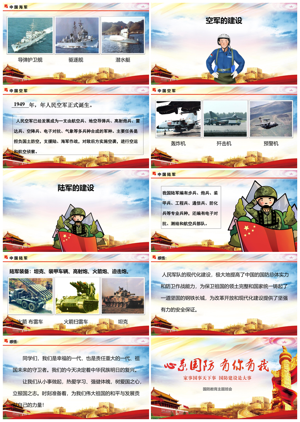 这是一张红色“国防教育”主题班会PPT模板,包含国防教育、主题班会等主题内容,也可用作红色国防教育主题班会、国防教育主题班会、红色国防教育、红色主题班会等PPT场景使用。 风云办公提供的红色“国防教育”主题班会PPT模板,下载格式为pptx,一共27页,作品中文字及图均可以修改和编辑,图片更改请在作品中右键图片并更换,文字修改请直接点击文字进行修改。