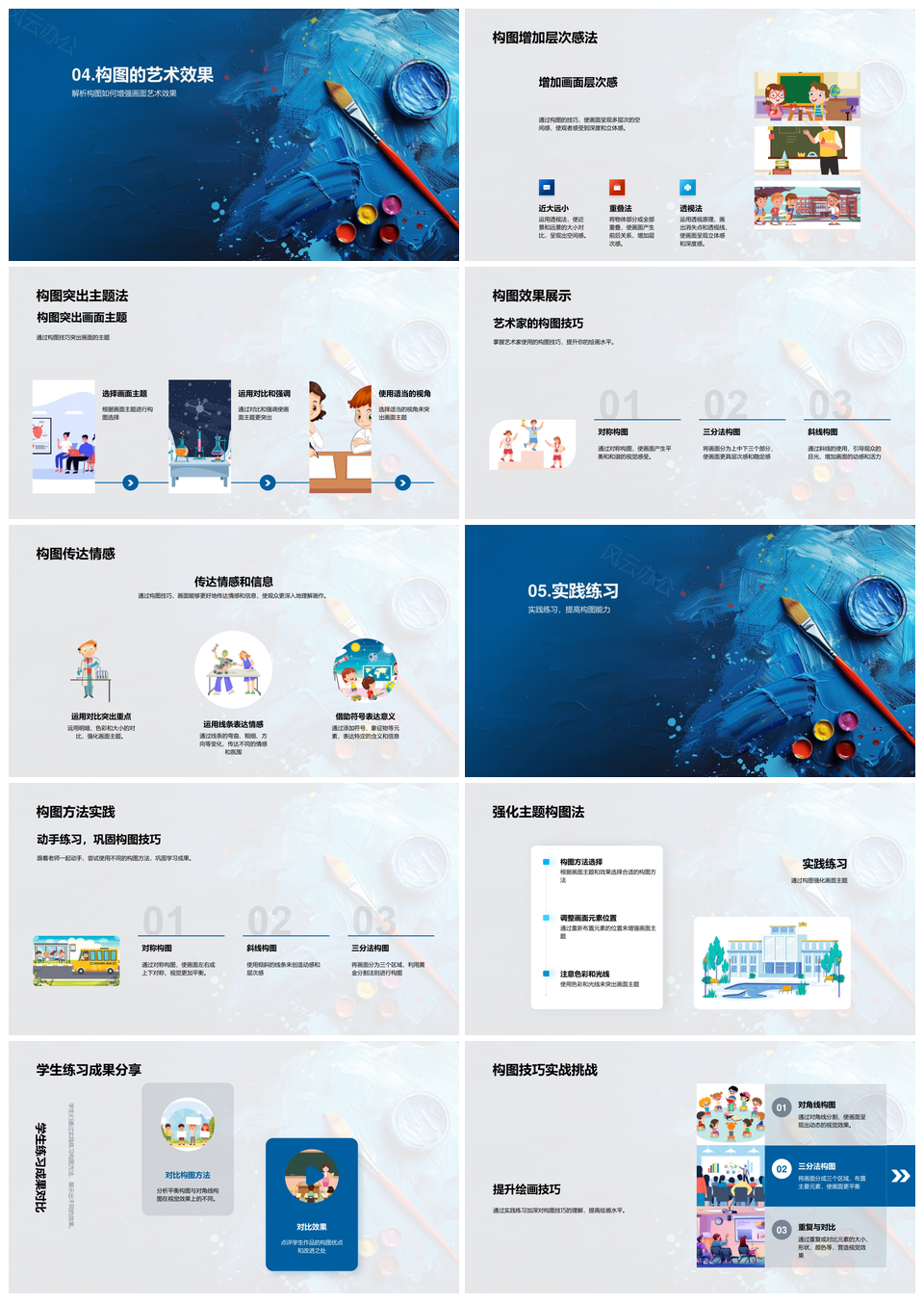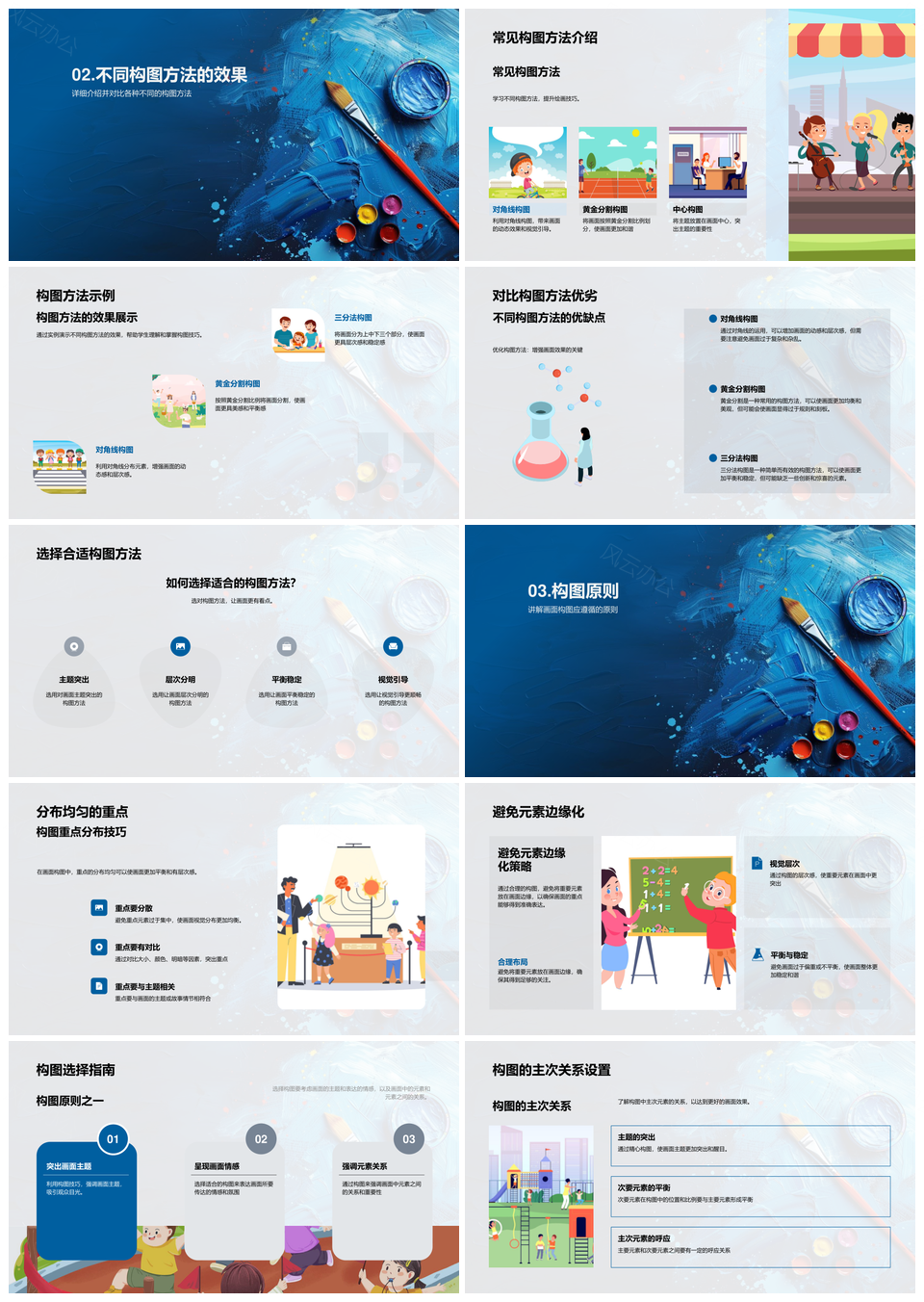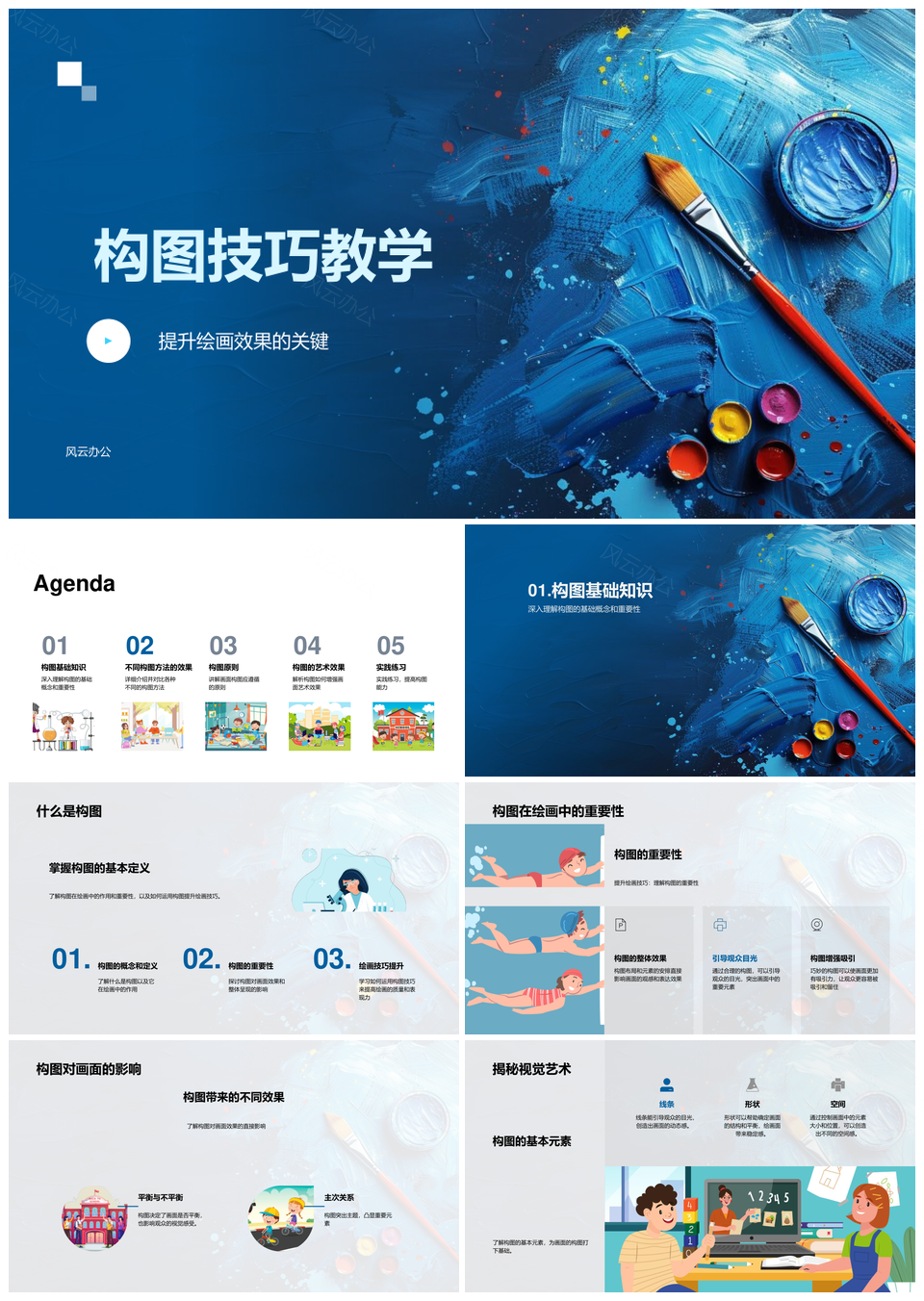 风云办公提供的视觉艺术构图技巧层次主题美术教学PPT模板,下载格式为pptx,一共28页,作品中文字及图均可以修改和编辑,图片更改请在作品中右键图片并更换,文字修改请直接点击文字进行修改。