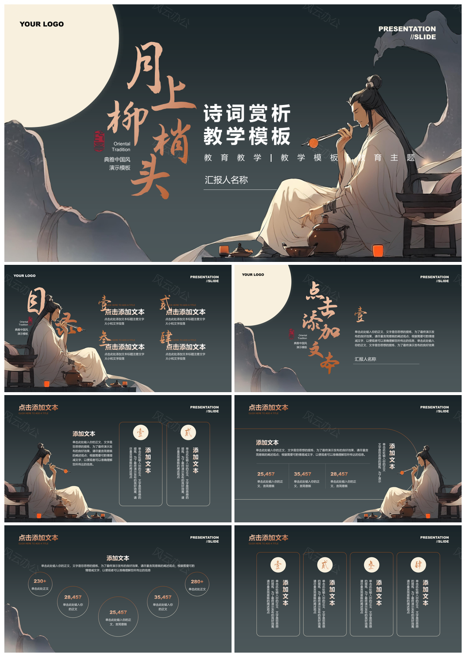 这是一张古风诗词月柳山水文人雅士品茶赏析教学PPT模板,包含古风、诗词、月柳、山水、文人雅士、品茶、赏析、教学等主题内容,也可用作古风诗词月柳山水、诗词月柳山水文人雅士、月柳山水文人雅士品茶、山水文人雅士品茶赏析、文人雅士品茶赏析教学、古风诗词月柳、诗词月柳山水、月柳山水文人雅士、山水文人雅士品茶、文人雅士品茶赏析、品茶赏析教学、古风诗词、月柳山水、文人雅士品茶、赏析教学等PPT场景使用。 风云办公提供的古风诗词月柳山水文人雅士品茶赏析教学PPT模板,下载格式为pptx,一共15页,作品中文字及图均可以修改和编辑,图片更改请在作品中右键图片并更换,文字修改请直接点击文字进行修改。