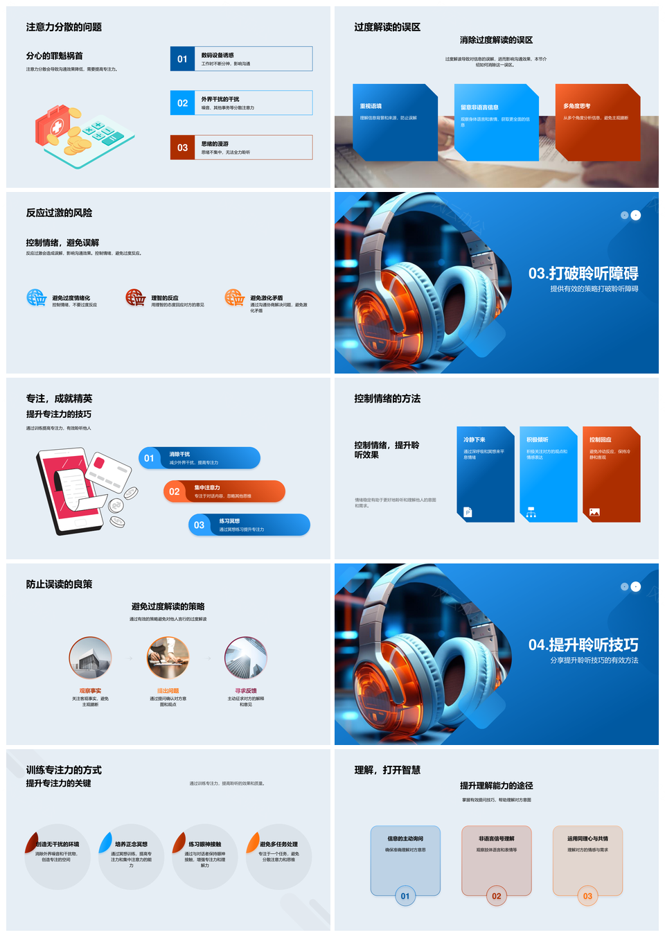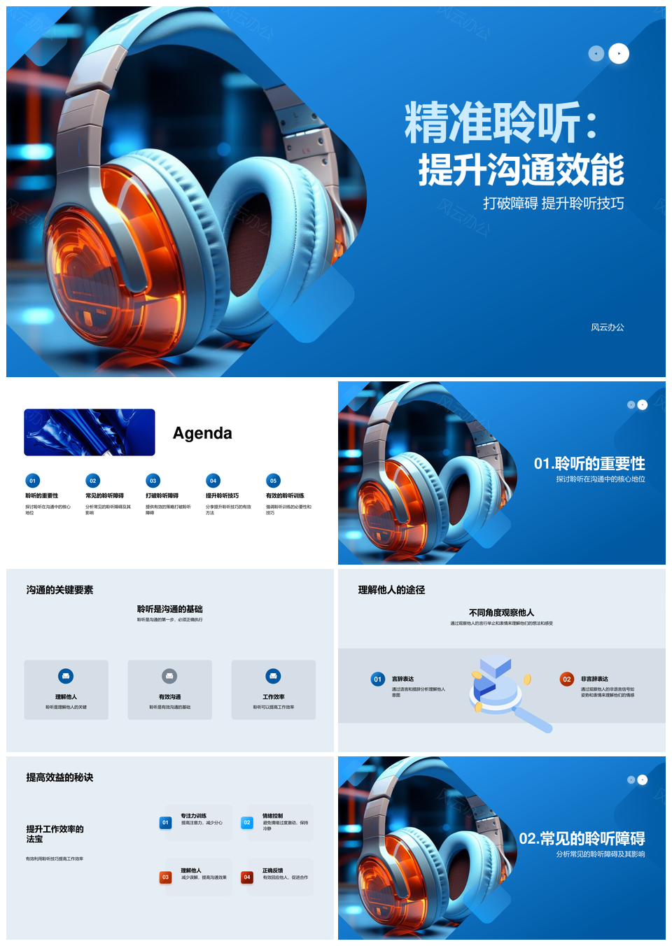 风云办公提供的精准聆听提升商务管理沟通效能培训PPT模板,下载格式为pptx,一共23页,作品中文字及图均可以修改和编辑,图片更改请在作品中右键图片并更换,文字修改请直接点击文字进行修改。