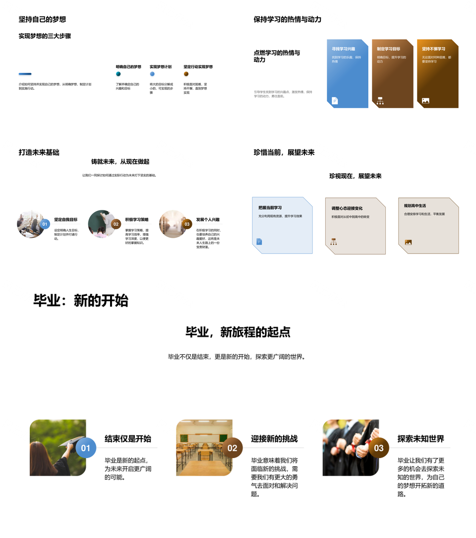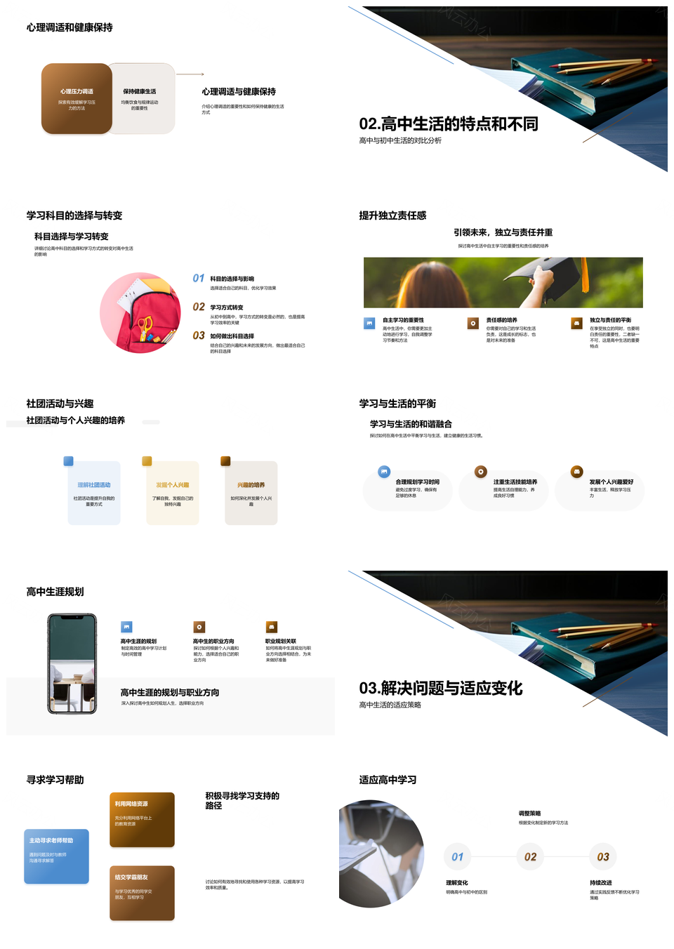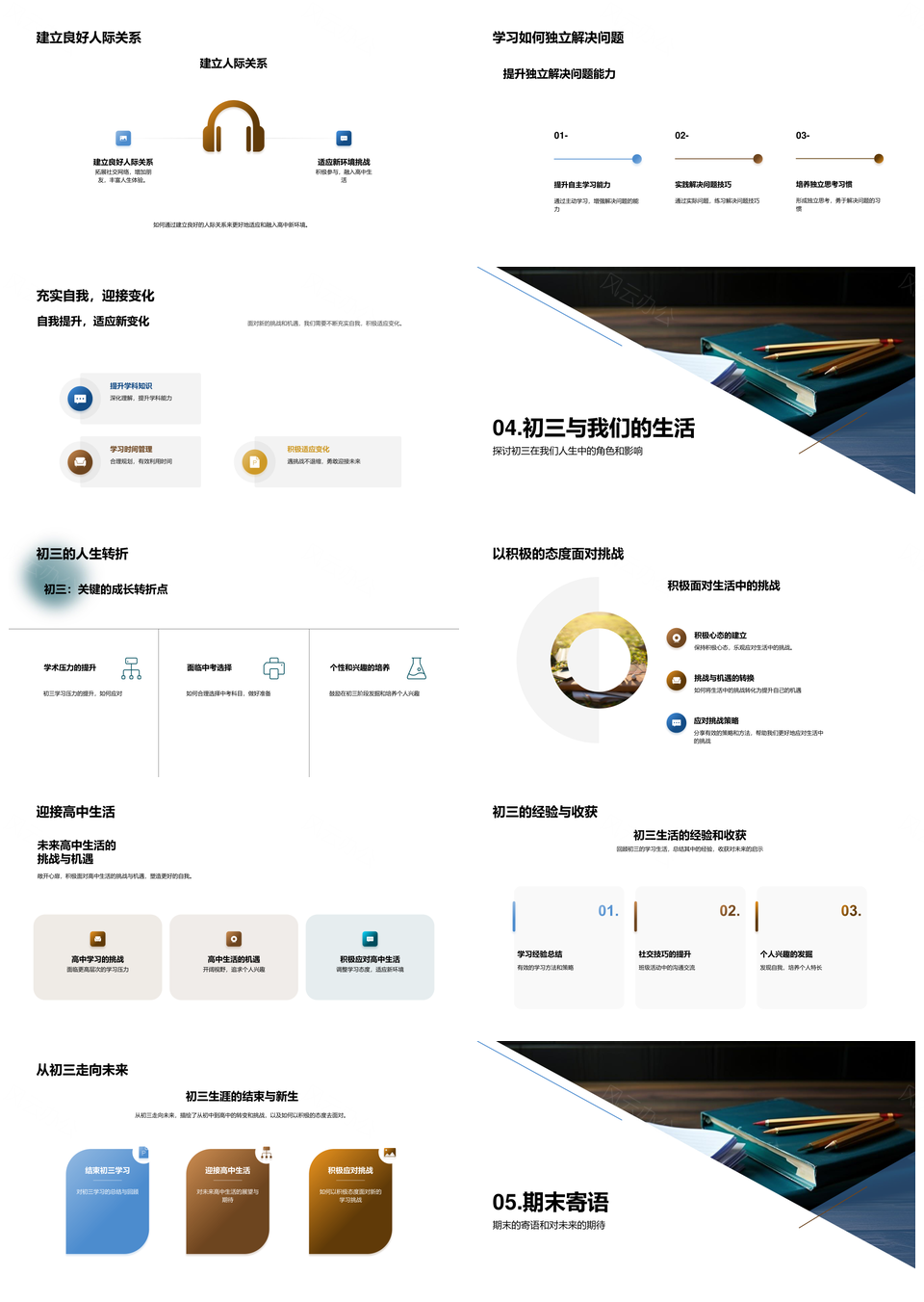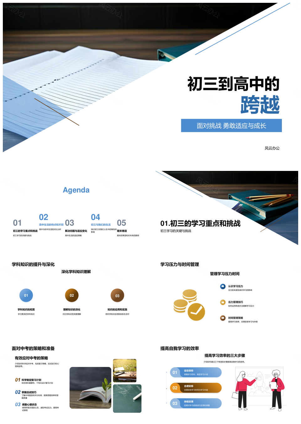 风云办公提供的初三跨越高中独立责任追梦前行PPT模板,下载格式为pptx,一共33页,作品中文字及图均可以修改和编辑,图片更改请在作品中右键图片并更换,文字修改请直接点击文字进行修改。