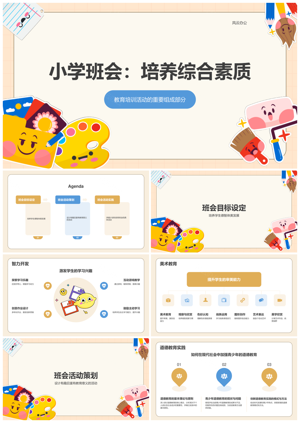 风云办公提供的小学德智体素质技能心理班会教育PPT模板,下载格式为pptx,一共17页,作品中文字及图均可以修改和编辑,图片更改请在作品中右键图片并更换,文字修改请直接点击文字进行修改。