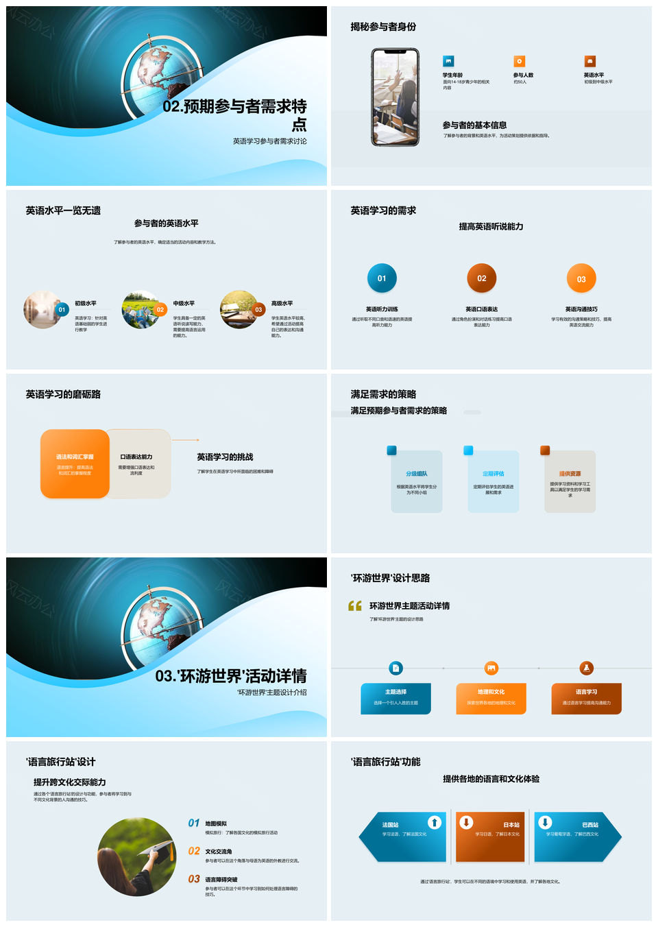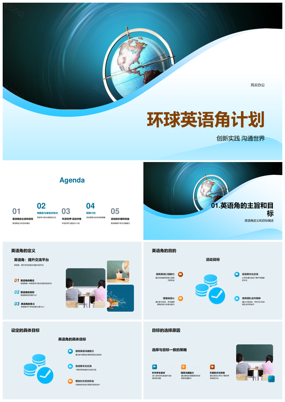 风云办公提供的环球英语角学生环游世界语言教育计划PPT模板,下载格式为pptx,一共30页,作品中文字及图均可以修改和编辑,图片更改请在作品中右键图片并更换,文字修改请直接点击文字进行修改。