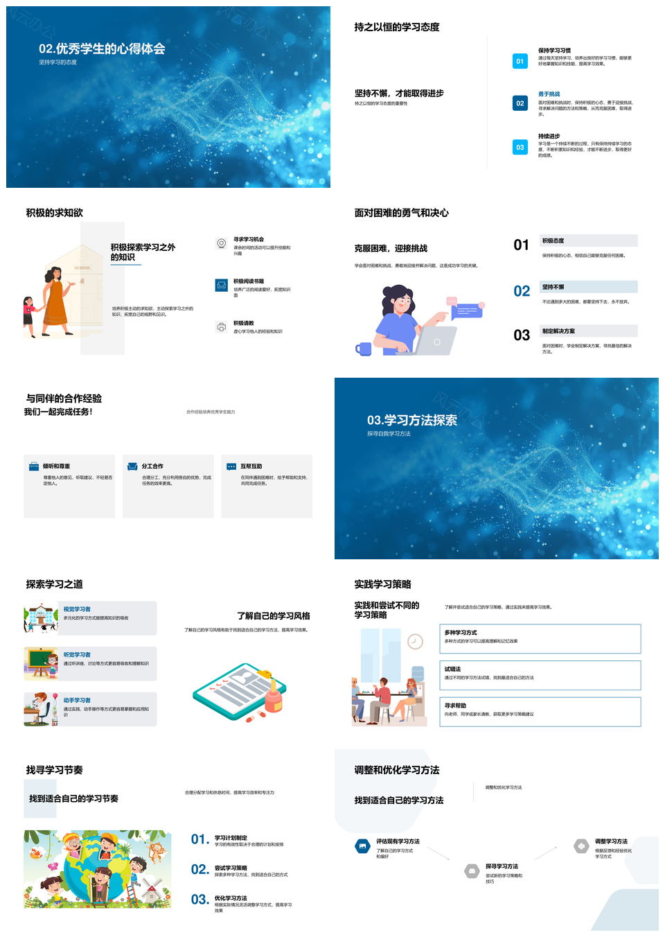 这是一张学习成长高效记忆时间管理课外资源求知同伴协作PPT模板,包含学习、成长、高效记忆、时间管理、课外资源、求知、同伴协作等主题内容,也可用作学习成长高效记忆、高效记忆时间管理课外资源、时间管理课外资源求知同伴、课外资源求知同伴协作、高效记忆时间管理、时间管理课外资源、课外资源求知同伴、求知同伴协作、学习成长高效、成长高效记忆、高效时间管理、课外资源求知、同伴协作高效、高效记忆、时间管理等PPT场景使用。 风云办公提供的学习成长高效记忆时间管理课外资源求知同伴协作PPT模板,下载格式为pptx,一共27页,作品中文字及图均可以修改和编辑,图片更改请在作品中右键图片并更换,文字修改请直接点击文字进行修改。
