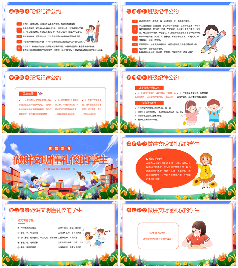 风云办公提供的2023秋季小学开学卡通儿童第一课班会课件,下载格式为pptx,一共26页,作品中文字及图均可以修改和编辑,图片更改请在作品中右键图片并更换,文字修改请直接点击文字进行修改。