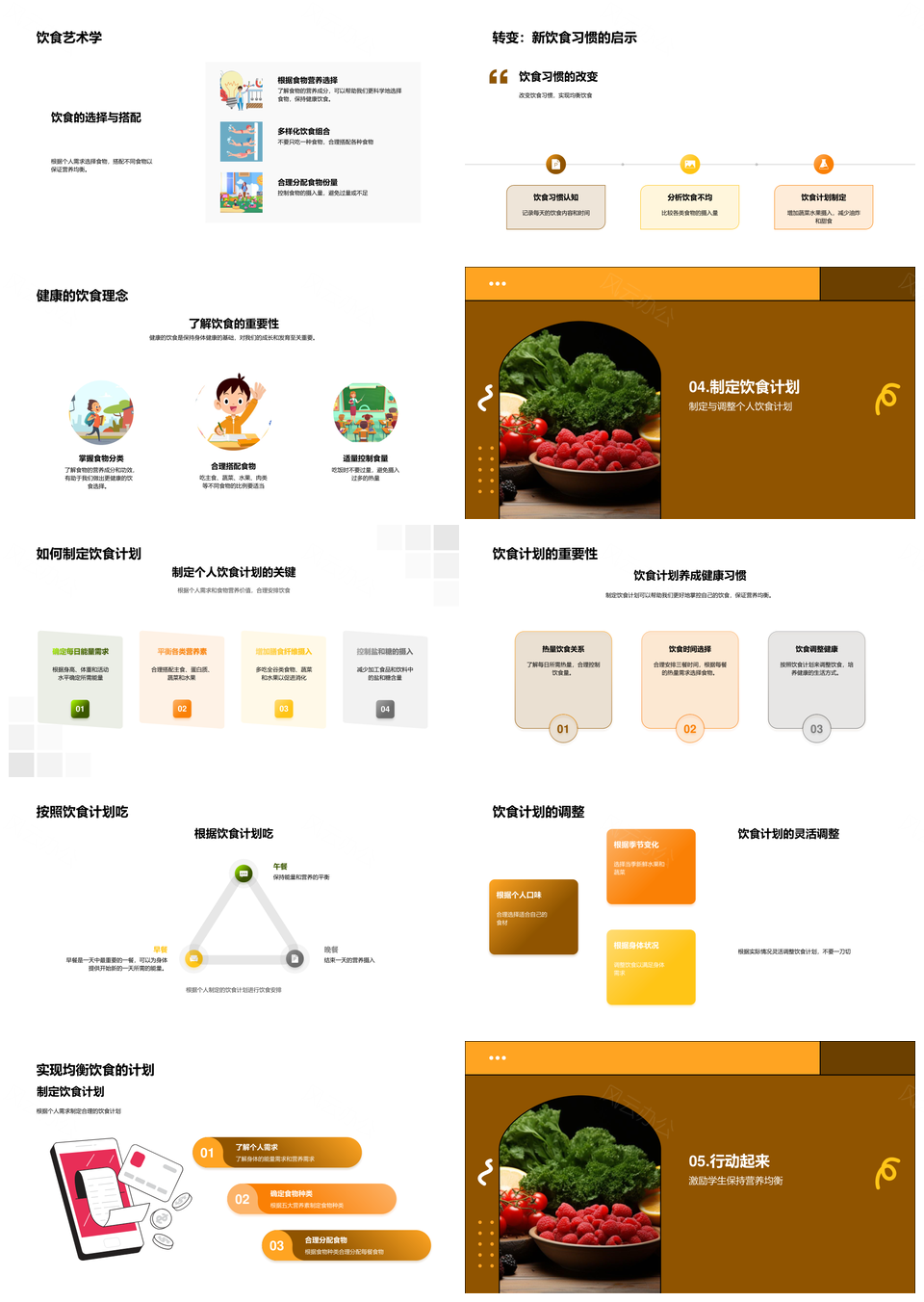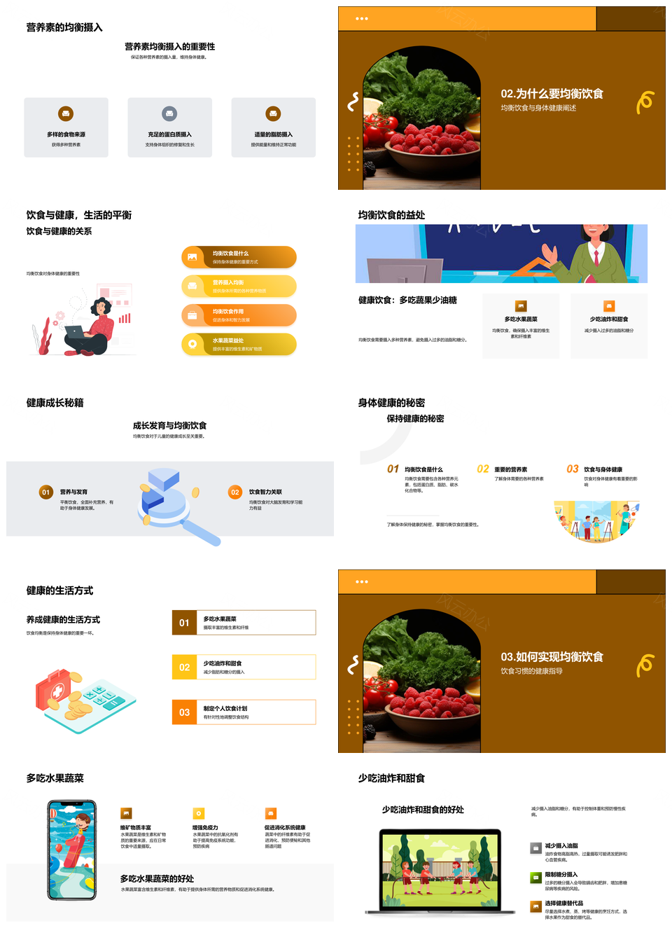 这是一张均衡饮食健康教育指导多蔬果少油炸甜食PPT模板,包含均衡饮食、健康、教育、指导、蔬果、油炸、甜食等主题内容,也可用作均衡饮食健康教育指导多蔬果、健康教育指导多蔬果少油炸、指导多蔬果少油炸甜食、均衡饮食健康教育指导、健康教育指导多蔬果、指导多蔬果少油炸、多蔬果少油炸甜食、均衡饮食健康教育、健康教育指导、指导多蔬果、多蔬果少油炸、少油炸甜食、均衡饮食健康、饮食健康教育指导、健康教育指导多等PPT场景使用。 风云办公提供的均衡饮食健康教育指导多蔬果少油炸甜食PPT模板,下载格式为pptx,一共33页,作品中文字及图均可以修改和编辑,图片更改请在作品中右键图片并更换,文字修改请直接点击文字进行修改。