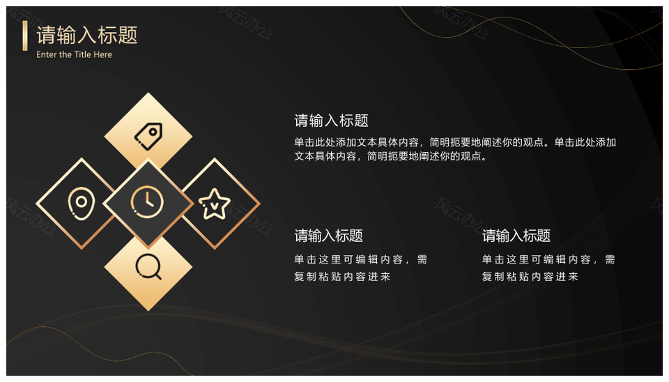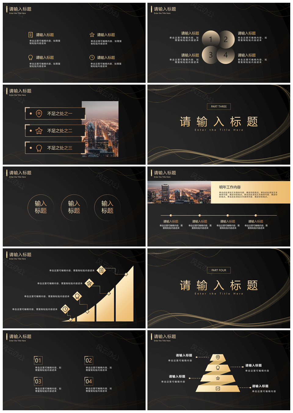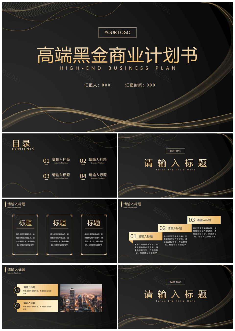 风云办公提供的黑金商务流体几何渐变时尚简约PPT模板,下载格式为pptx,一共19页,作品中文字及图均可以修改和编辑,图片更改请在作品中右键图片并更换,文字修改请直接点击文字进行修改。