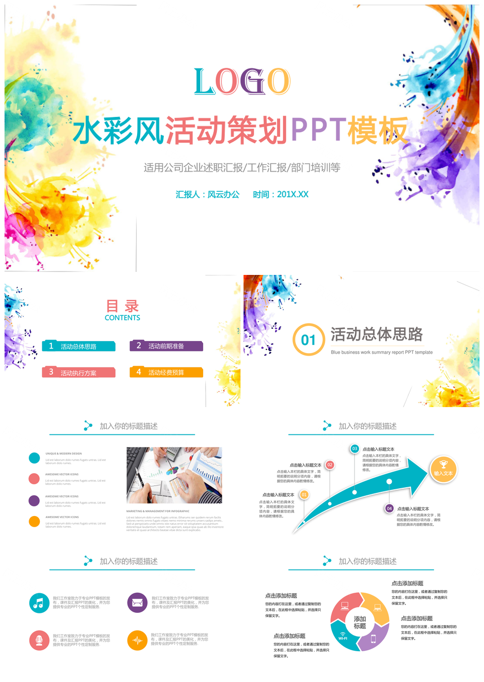 这是一张水彩风活动策划PPT模板,包含水彩风、活动策划等主题内容,也可用作水彩风、活动、策划 水彩风活动策划、水彩风活动、水彩风策划、活动策划等PPT场景使用。 风云办公提供的水彩风活动策划PPT模板,下载格式为pptx,一共27页,作品中文字及图均可以修改和编辑,图片更改请在作品中右键图片并更换,文字修改请直接点击文字进行修改。