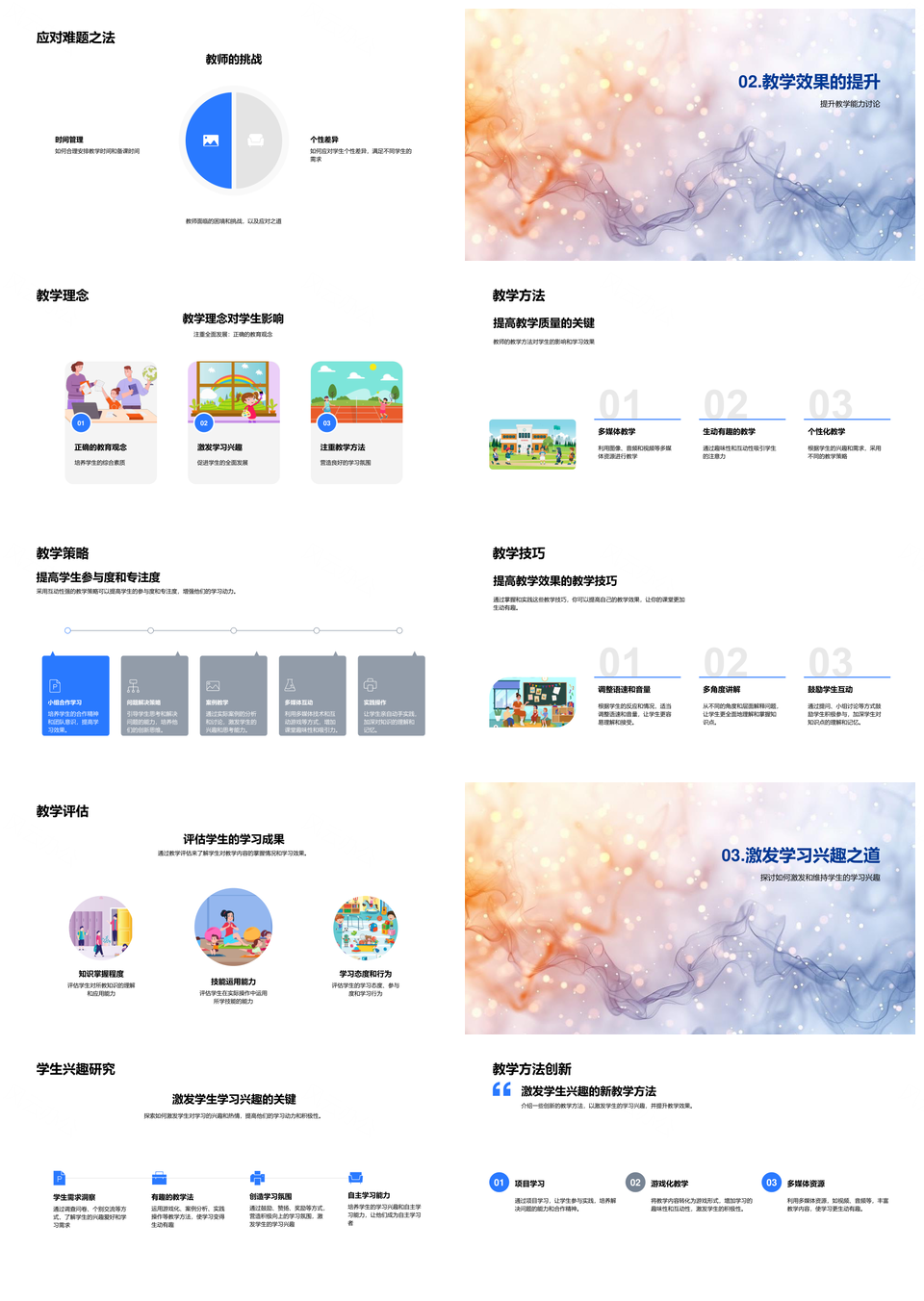 这是一张教师教学创新研讨会分享方法理念效果工具PPT模板,包含教师教学、创新研讨会、分享、方法、理念、效果、工具等主题内容,也可用作教师教学创新研讨会、教学创新研讨会分享、研讨会分享方法理念、分享方法理念效果、方法理念效果工具、教师教学创新、教学创新研讨会、研讨会分享方法、分享方法理念、方法理念效果、教师教学、教学创新、研讨会分享、分享方法、方法理念等PPT场景使用。 风云办公提供的教师教学创新研讨会分享方法理念效果工具PPT模板,下载格式为pptx,一共33页,作品中文字及图均可以修改和编辑,图片更改请在作品中右键图片并更换,文字修改请直接点击文字进行修改。