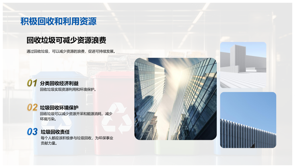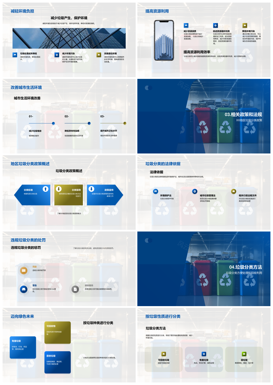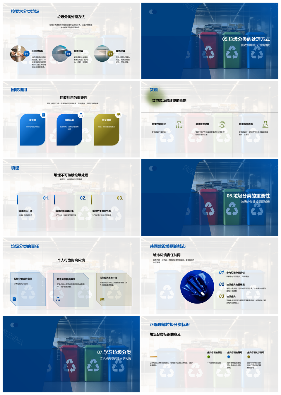 这是一张城市垃圾分类指南环保减负高效回收利用PPT模板,包含城市垃圾、分类指南、环保、减负、高效、回收利用等主题内容,也可用作城市垃圾分类指南、垃圾分类指南环保减负、环保减负高效回收、减负高效回收利用、城市垃圾环保减负、分类指南环保减负、指南环保减负高效、高效回收利用环保、垃圾分类高效回收、环保减负回收利用、城市环保减负高效、垃圾减负高效回收、高效回收利用减负、分类指南回收利用、环保高效回收利用等PPT场景使用。 风云办公提供的城市垃圾分类指南环保减负高效回收利用PPT模板,下载格式为pptx,一共29页,作品中文字及图均可以修改和编辑,图片更改请在作品中右键图片并更换,文字修改请直接点击文字进行修改。
