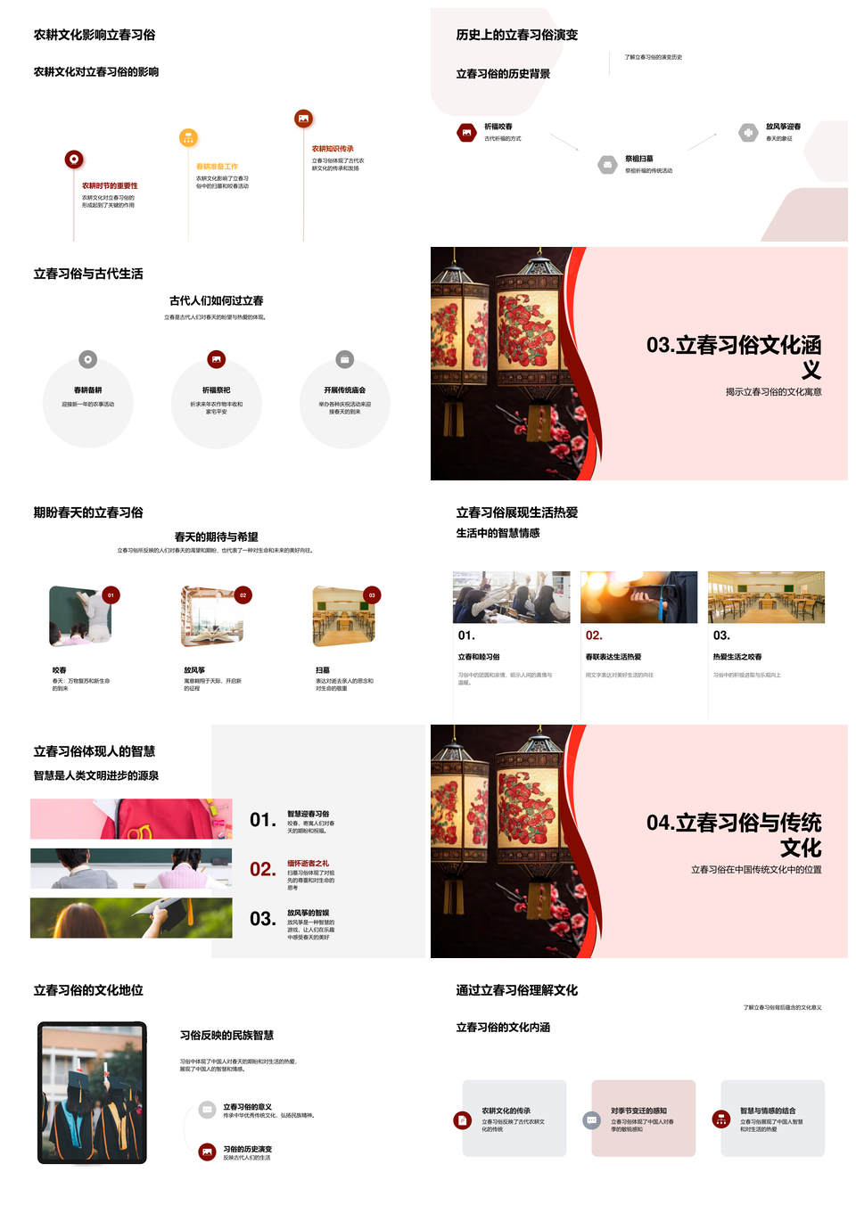 这是一张立春农耕文化传统灯笼历史PPT模板,包含立春、农耕、文化、传统、灯笼、历史等主题内容,也可用作立春农耕文化传统、农耕文化传统灯笼、文化传统灯笼历史、立春农耕文化、农耕文化传统、文化传统灯笼、传统灯笼历史、立春农耕、农耕文化、文化传统、传统灯笼、灯笼历史、立春传统、农耕传统、文化历史等PPT场景使用。 风云办公提供的立春农耕文化传统灯笼历史PPT模板,下载格式为pptx,一共23页,作品中文字及图均可以修改和编辑,图片更改请在作品中右键图片并更换,文字修改请直接点击文字进行修改。