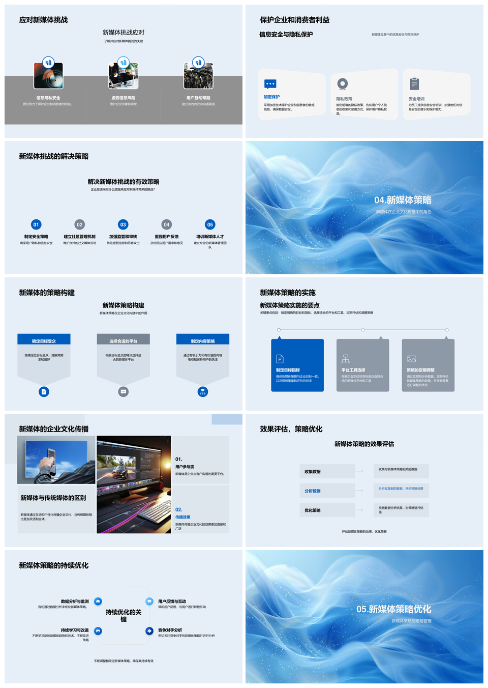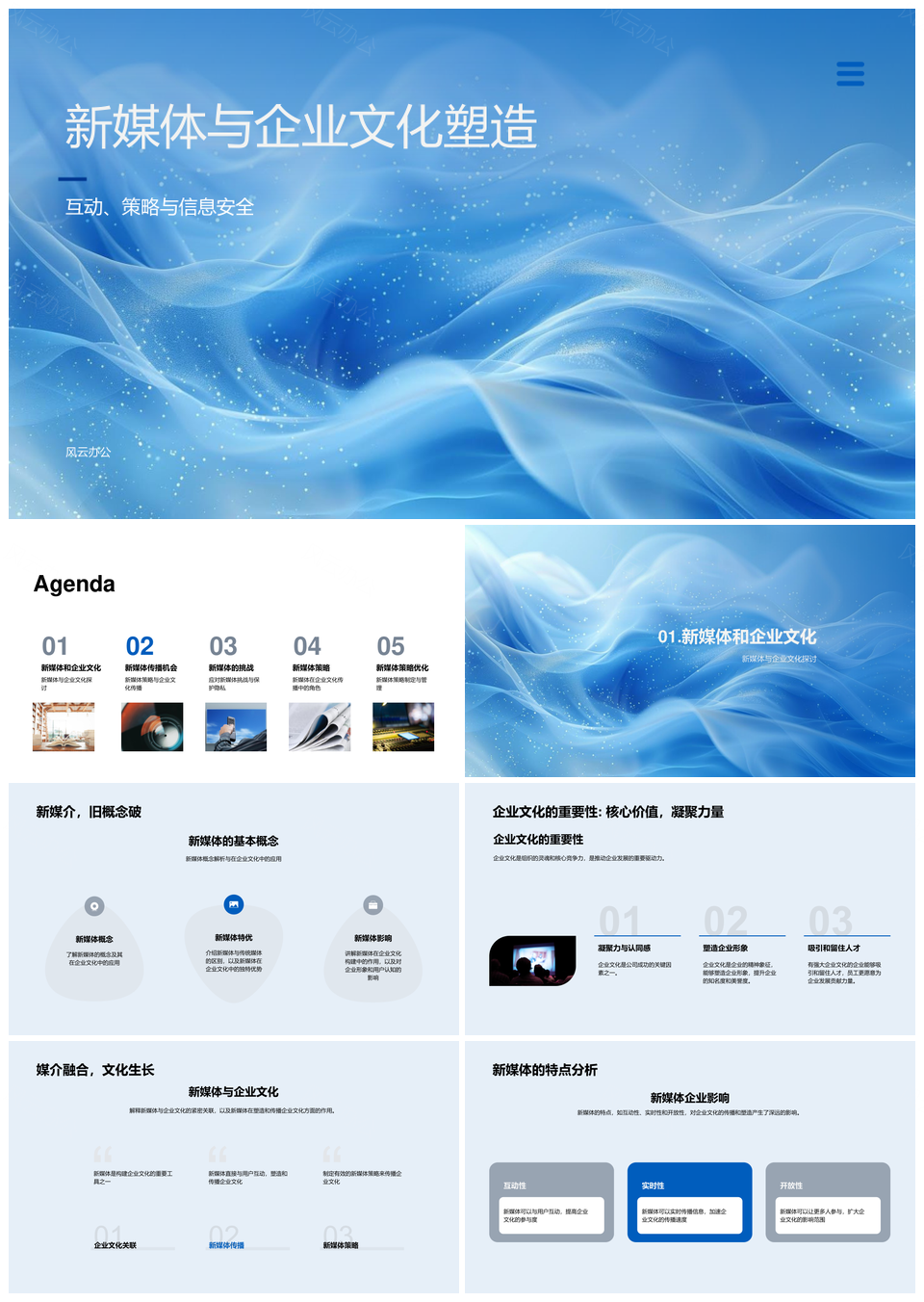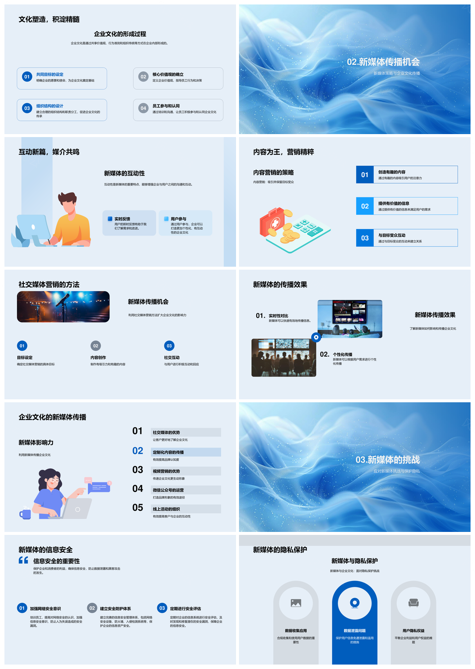 风云办公提供的新媒体企业文化互动策略与信息安全PPT模板,下载格式为pptx,一共33页,作品中文字及图均可以修改和编辑,图片更改请在作品中右键图片并更换,文字修改请直接点击文字进行修改。