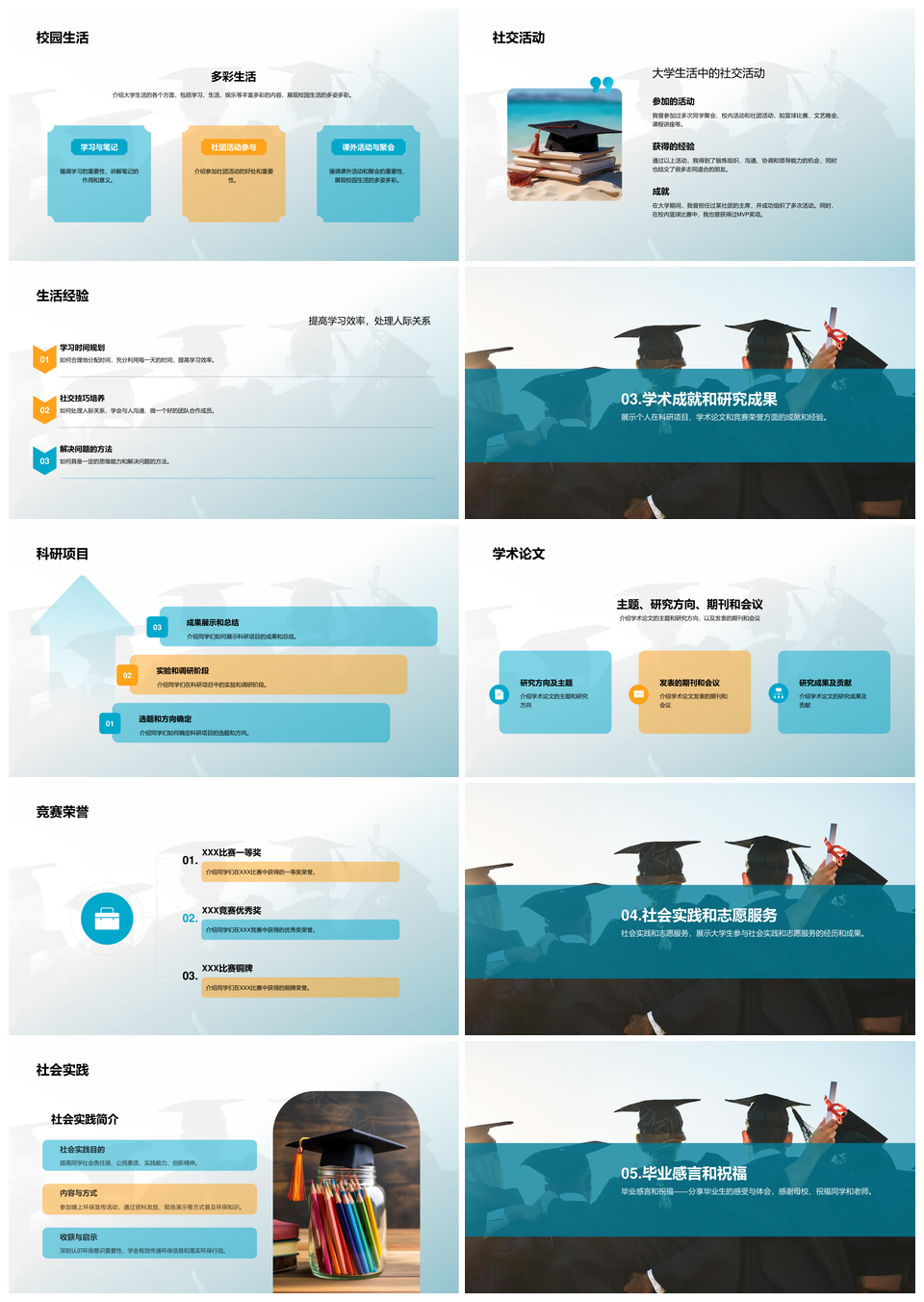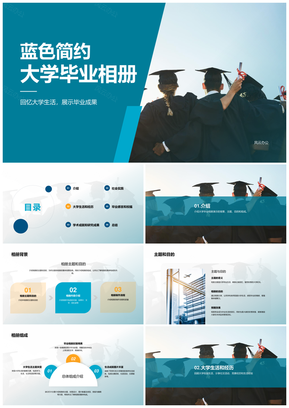 风云办公提供的蓝色现代大学生毕业纪念相册图集PPT模板,下载格式为pptx,一共23页,作品中文字及图均可以修改和编辑,图片更改请在作品中右键图片并更换,文字修改请直接点击文字进行修改。