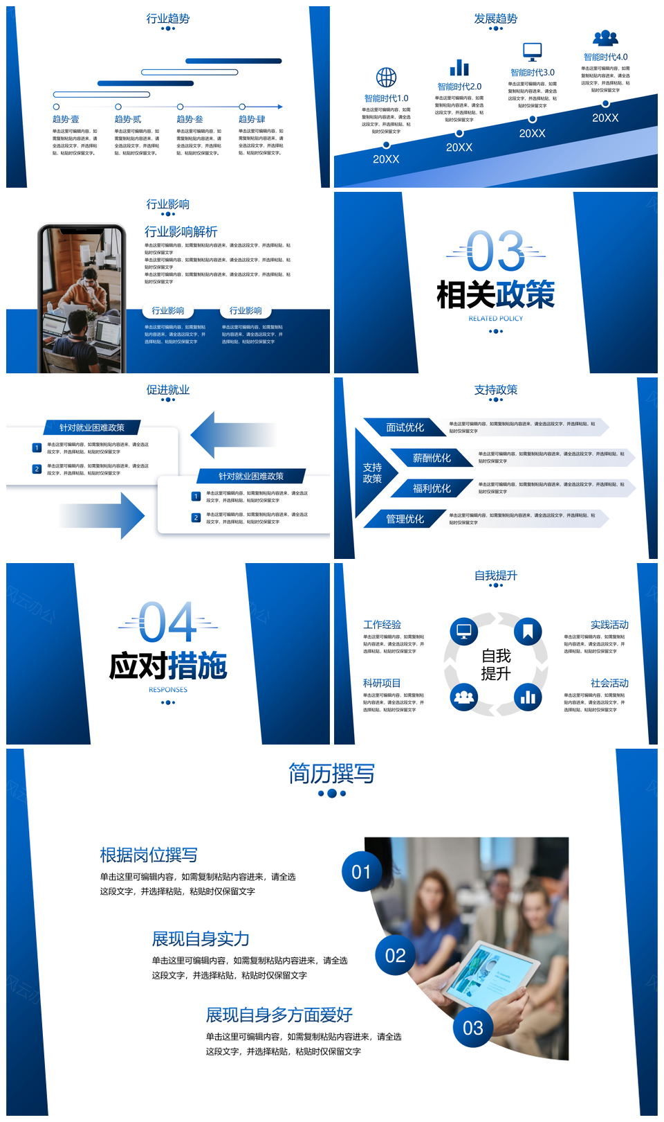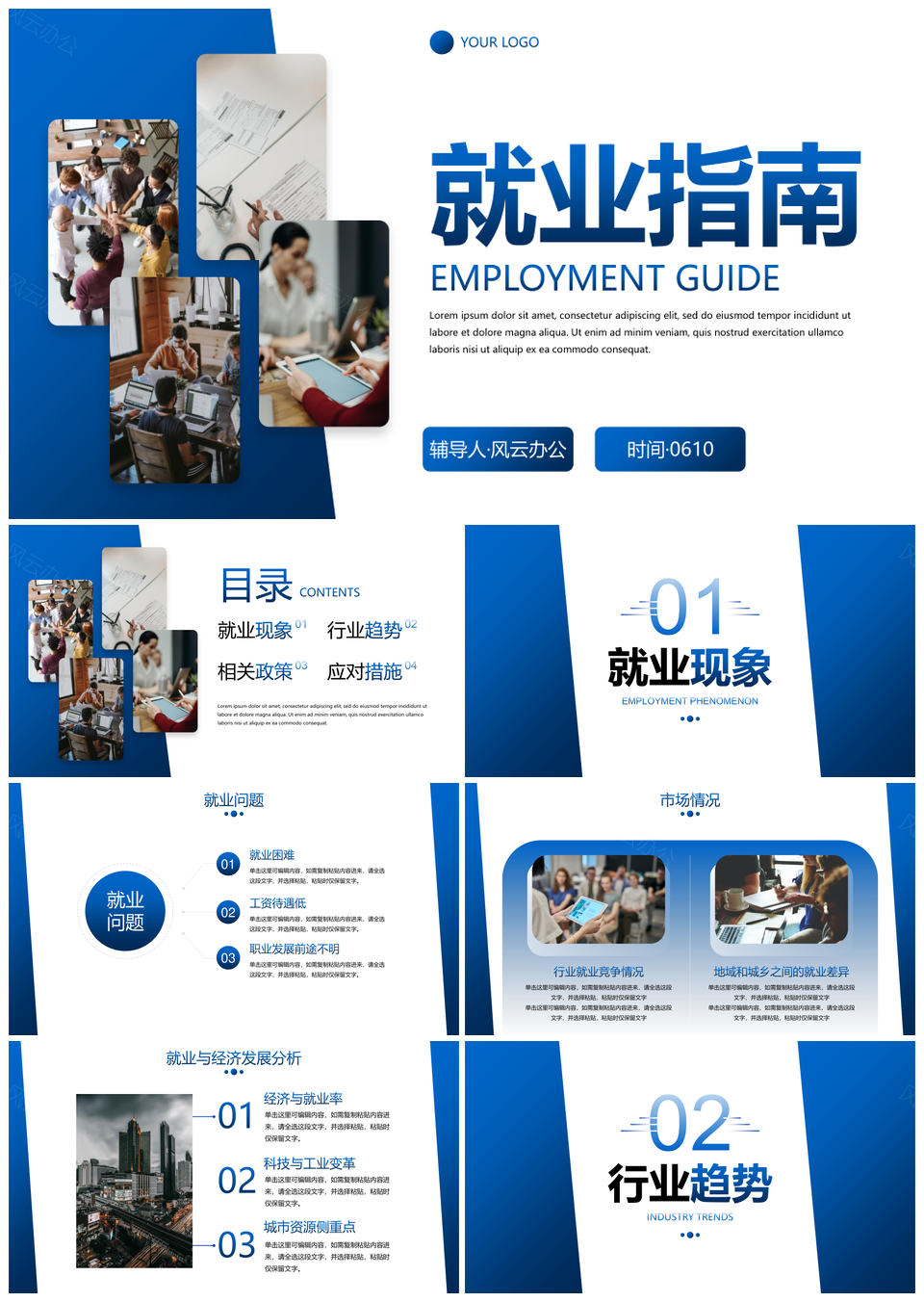 风云办公提供的蓝色几何商务大学生就业指南PPT模板,下载格式为pptx,一共17页,作品中文字及图均可以修改和编辑,图片更改请在作品中右键图片并更换,文字修改请直接点击文字进行修改。