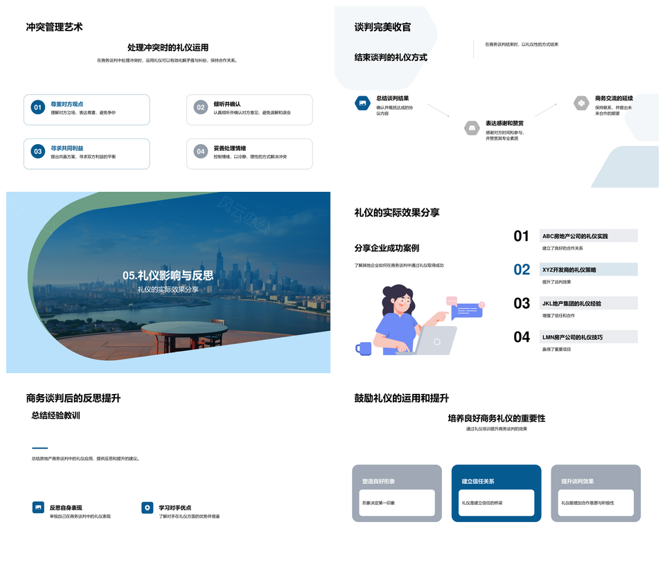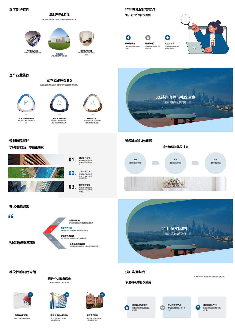 风云办公提供的房地产商务谈判礼仪技巧与解决方案PPT模板,下载格式为pptx,一共24页,作品中文字及图均可以修改和编辑,图片更改请在作品中右键图片并更换,文字修改请直接点击文字进行修改。