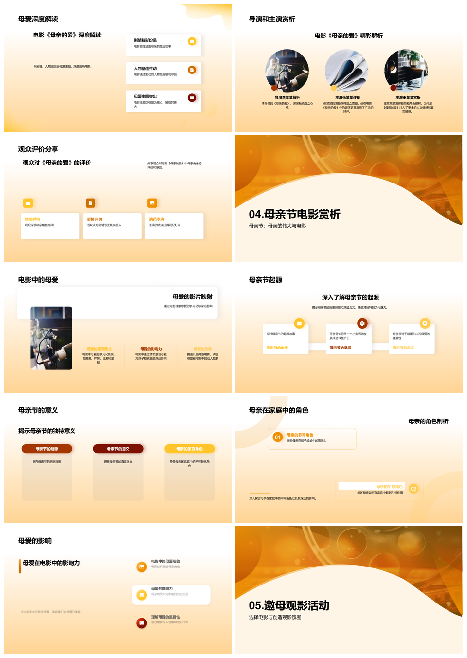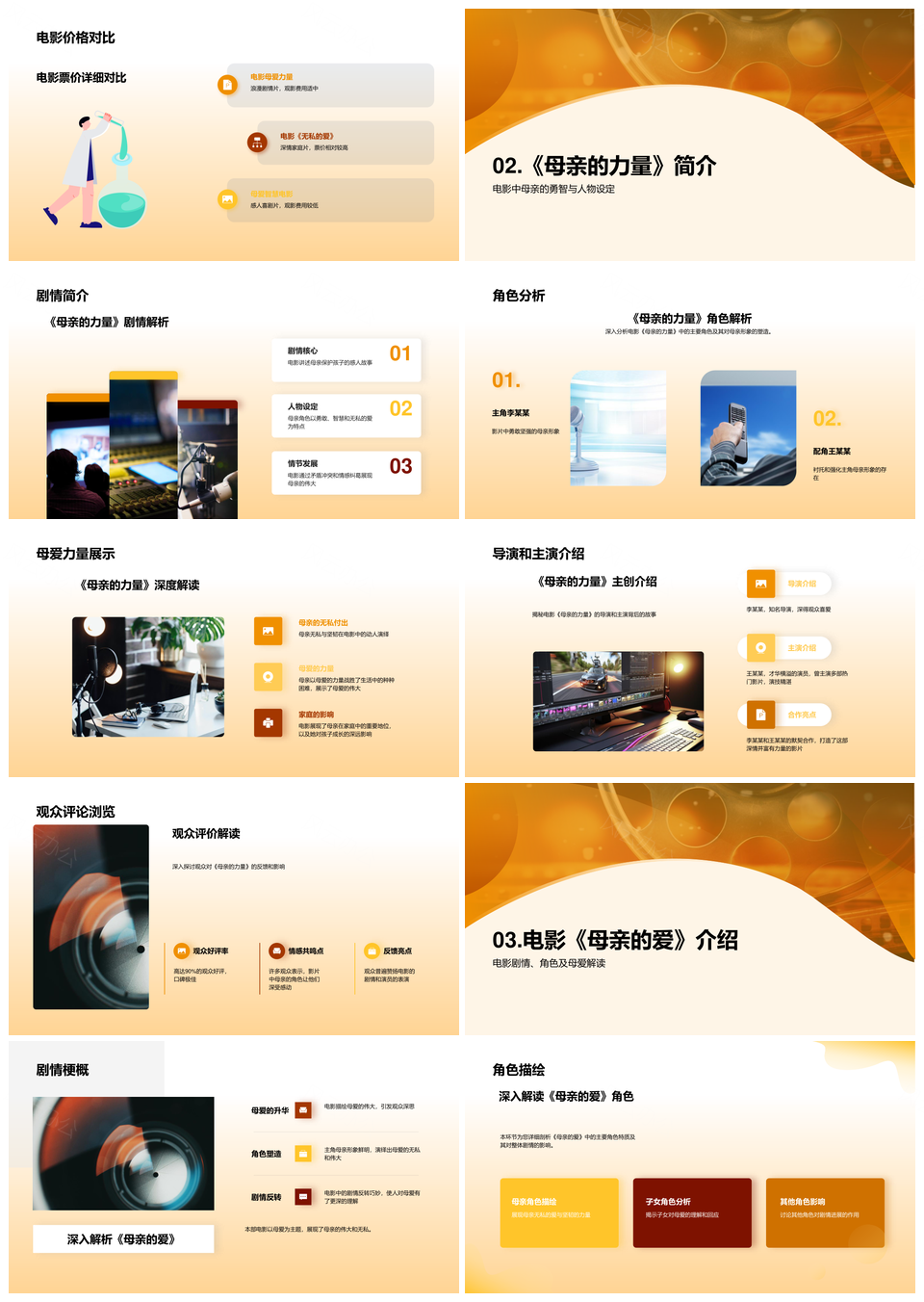 风云办公提供的母爱力量胶片名导力作母亲节票房口碑PPT模板,下载格式为pptx,一共33页,作品中文字及图均可以修改和编辑,图片更改请在作品中右键图片并更换,文字修改请直接点击文字进行修改。