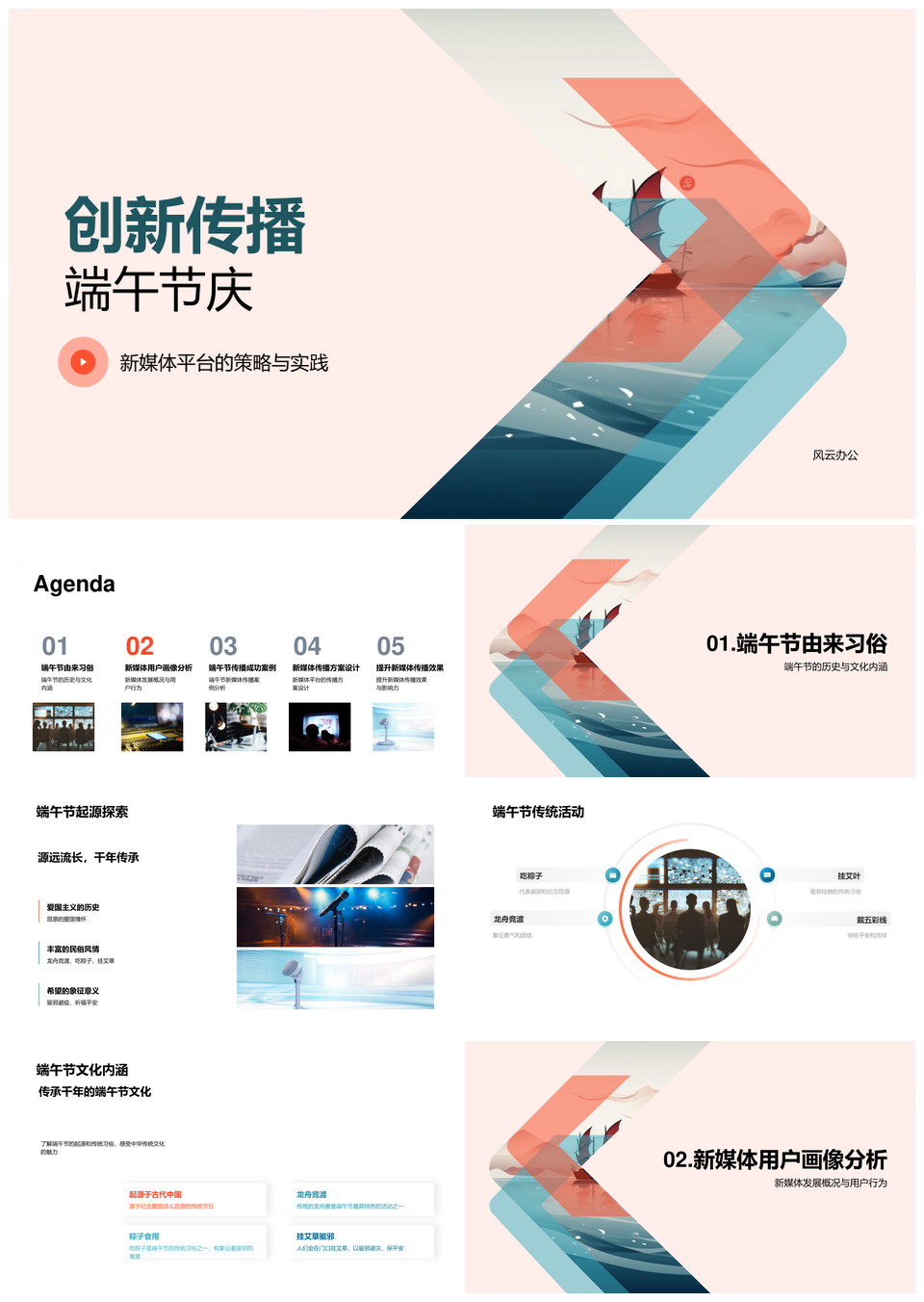 风云办公提供的新媒体端龙舟创新传播策略实践PPT模板,下载格式为pptx,一共23页,作品中文字及图均可以修改和编辑,图片更改请在作品中右键图片并更换,文字修改请直接点击文字进行修改。