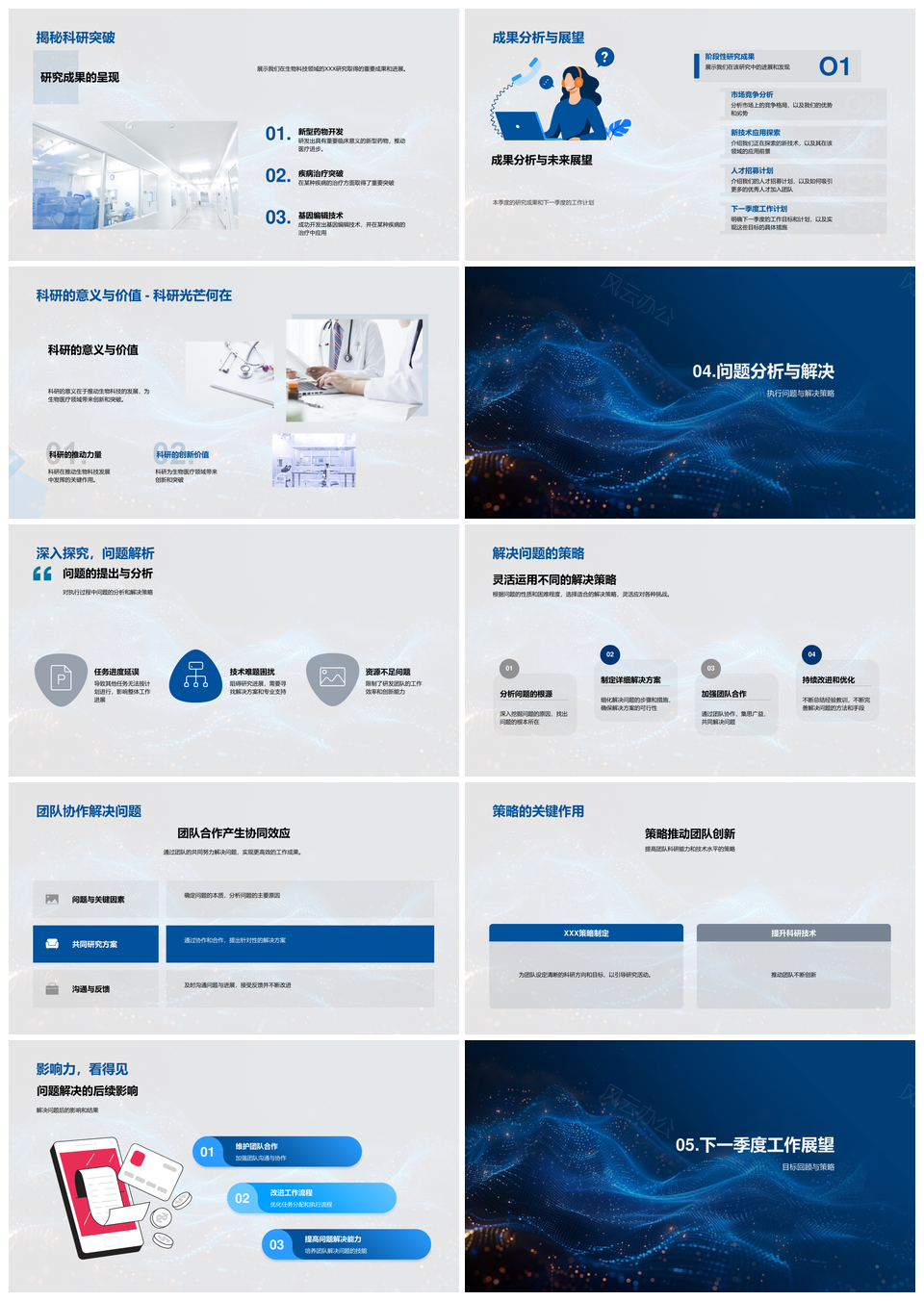 这是一张生物科技研发团队季度目标分解执行成果问题解决汇报PPT模板,包含生物科技、研发团队、季度目标、分解、执行、成果、问题、解决、汇报等主题内容,也可用作生物科技研发团队季度目标分解、研发团队季度目标分解执行成果、季度目标分解执行成果问题解决、分解执行成果问题解决汇报、生物科技研发团队季度目标、研发团队季度目标分解、季度目标分解执行成果、分解执行成果问题解决、执行成果问题解决汇报、生物科技研发团队、研发团队季度目标、季度目标分解、分解执行成果、执行成果问题解决、问题解决汇报等PPT场景使用。 风云办公提供的生物科技研发团队季度目标分解执行成果问题解决汇报PPT模板,下载格式为pptx,一共33页,作品中文字及图均可以修改和编辑,图片更改请在作品中右键图片并更换,文字修改请直接点击文字进行修改。