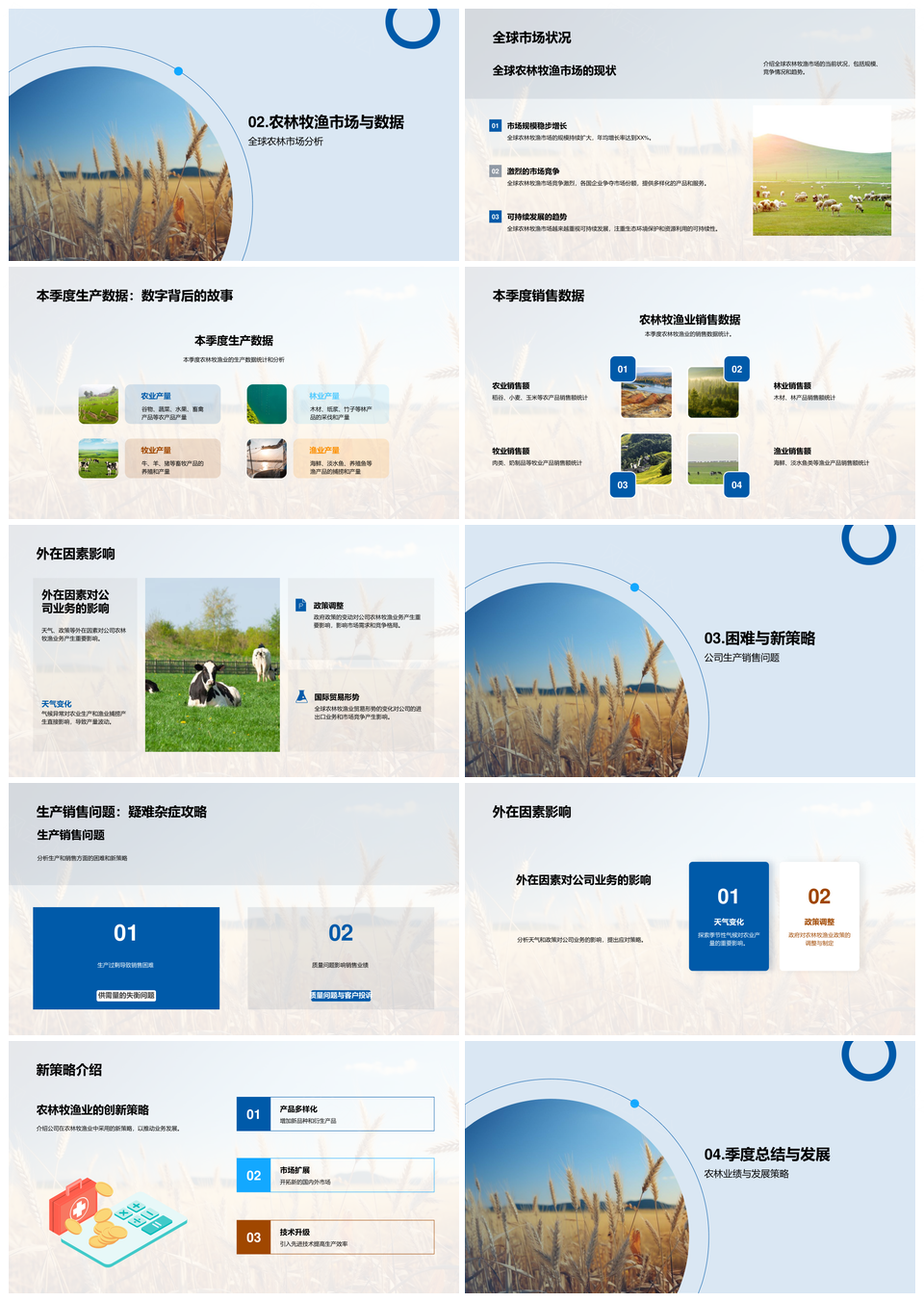 风云办公提供的农林牧渔季报全球产销新策略展望PPT模板,下载格式为pptx,一共25页,作品中文字及图均可以修改和编辑,图片更改请在作品中右键图片并更换,文字修改请直接点击文字进行修改。