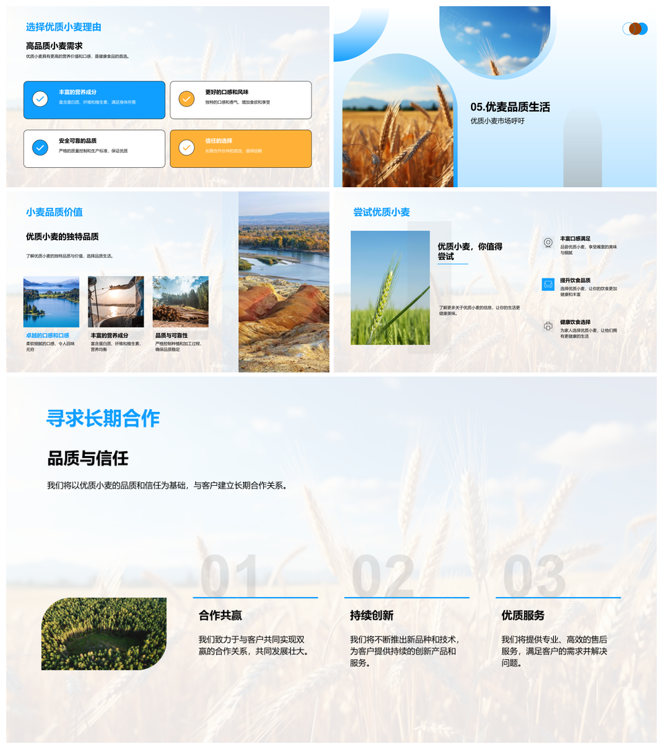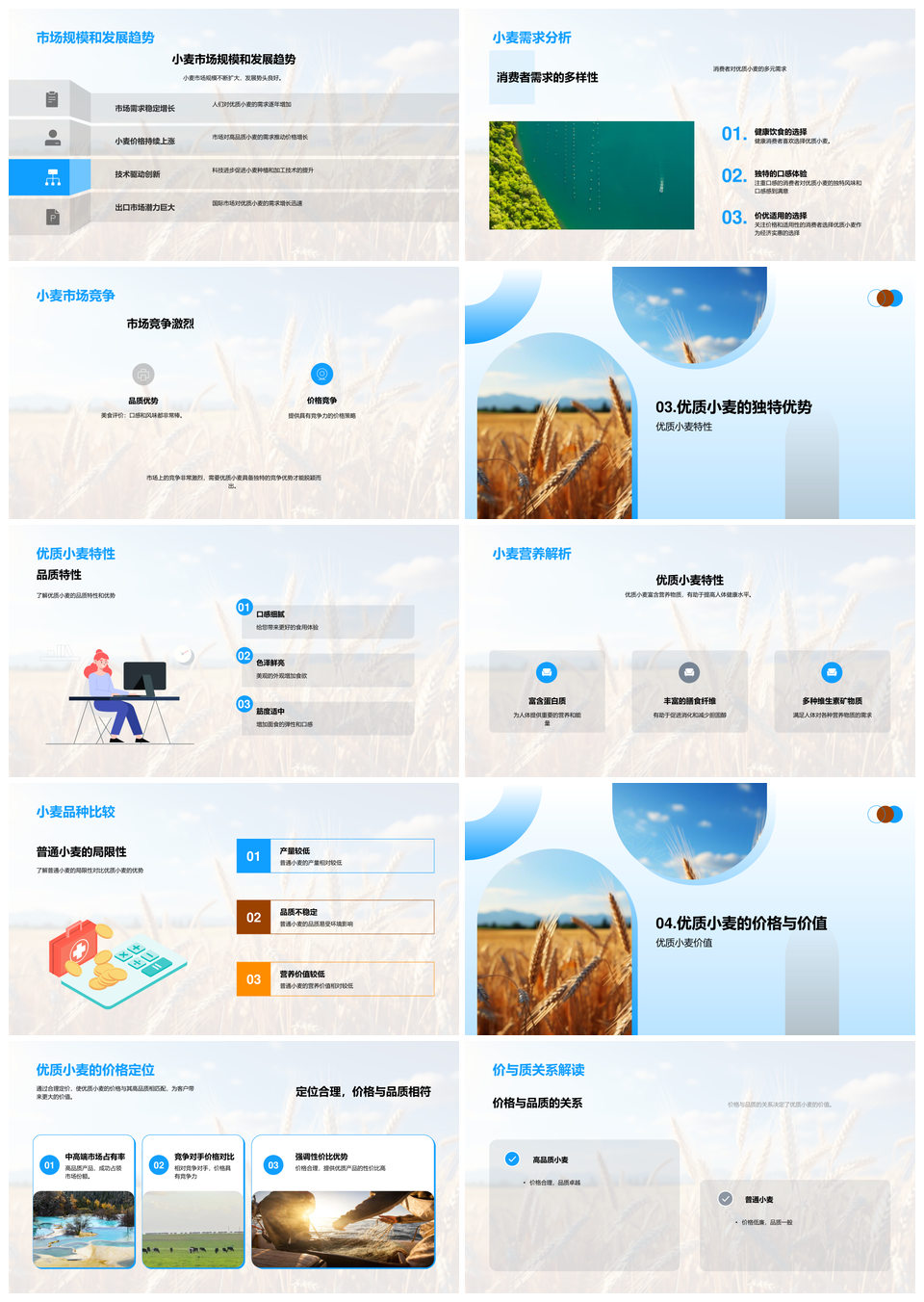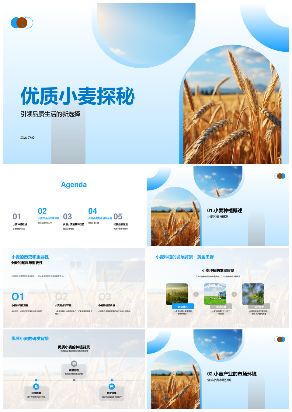 风云办公提供的优质小麦种植市场趋势与品质解析PPT模板,下载格式为pptx,一共23页,作品中文字及图均可以修改和编辑,图片更改请在作品中右键图片并更换,文字修改请直接点击文字进行修改。