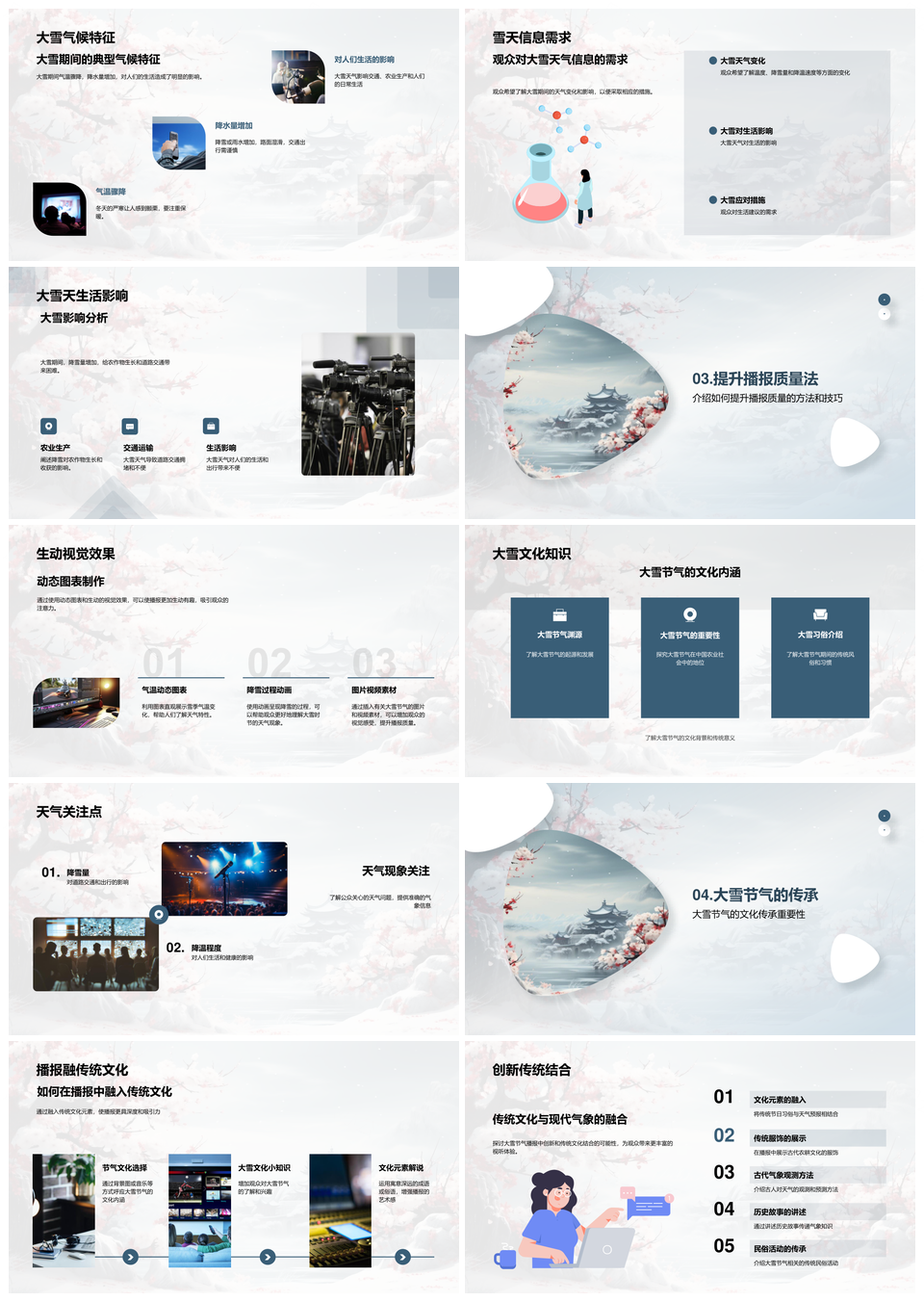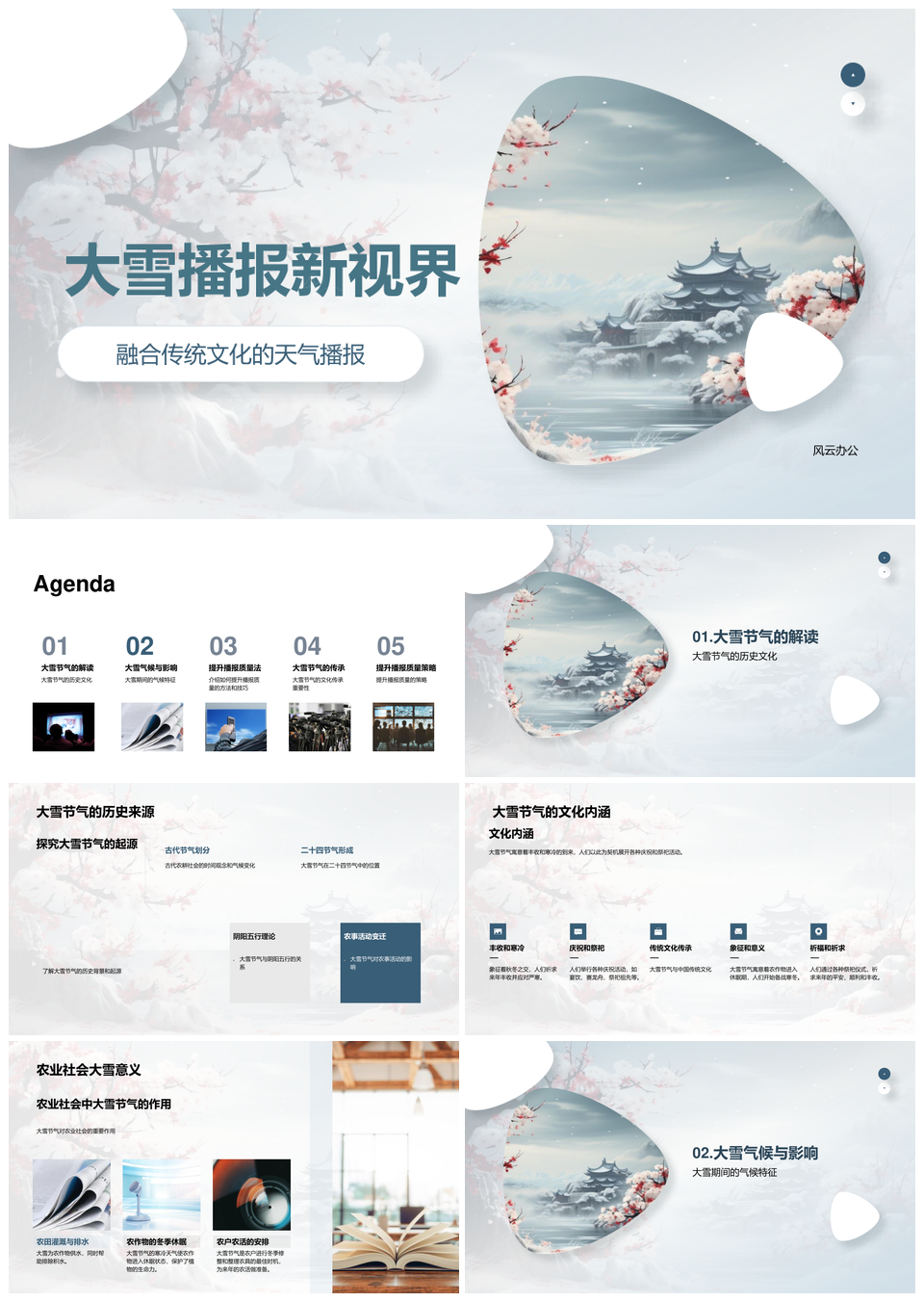 风云办公提供的大雪节气雪韵播报传扬传统文化PPT模板,下载格式为pptx,一共23页,作品中文字及图均可以修改和编辑,图片更改请在作品中右键图片并更换,文字修改请直接点击文字进行修改。