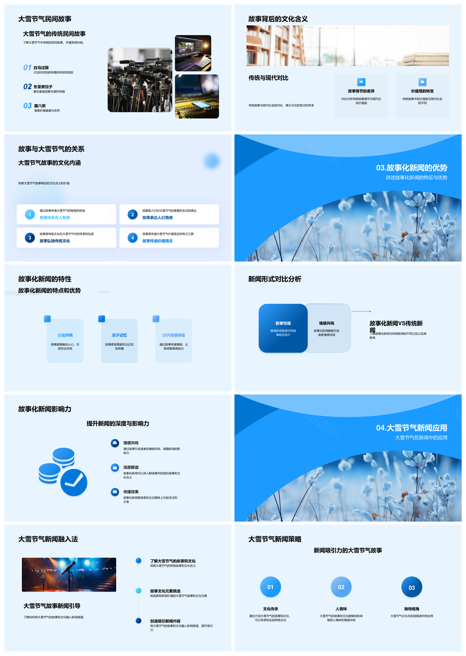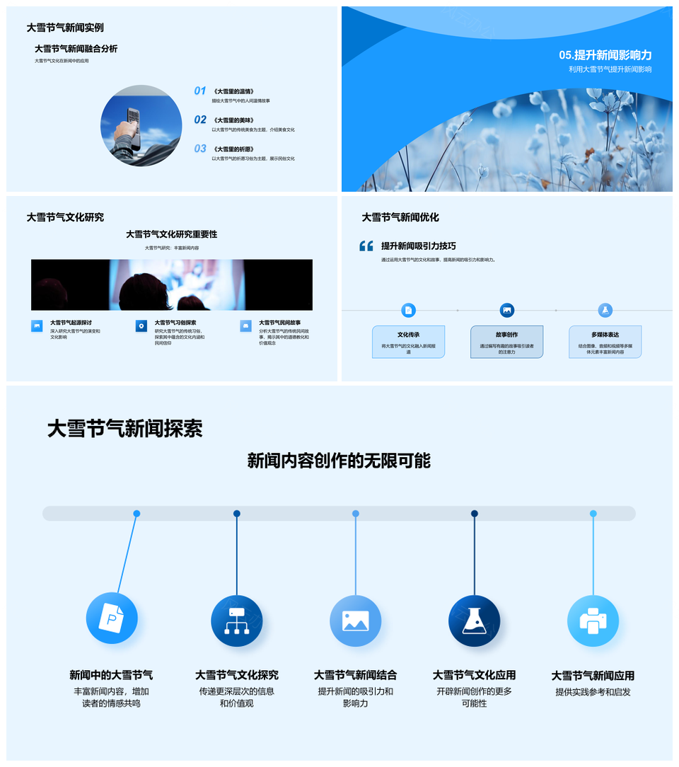 风云办公提供的大雪节气媒介故事传习俗文化PPT模板,下载格式为pptx,一共23页,作品中文字及图均可以修改和编辑,图片更改请在作品中右键图片并更换,文字修改请直接点击文字进行修改。
