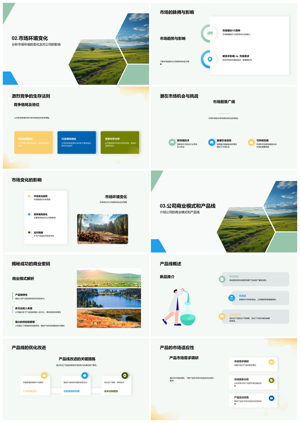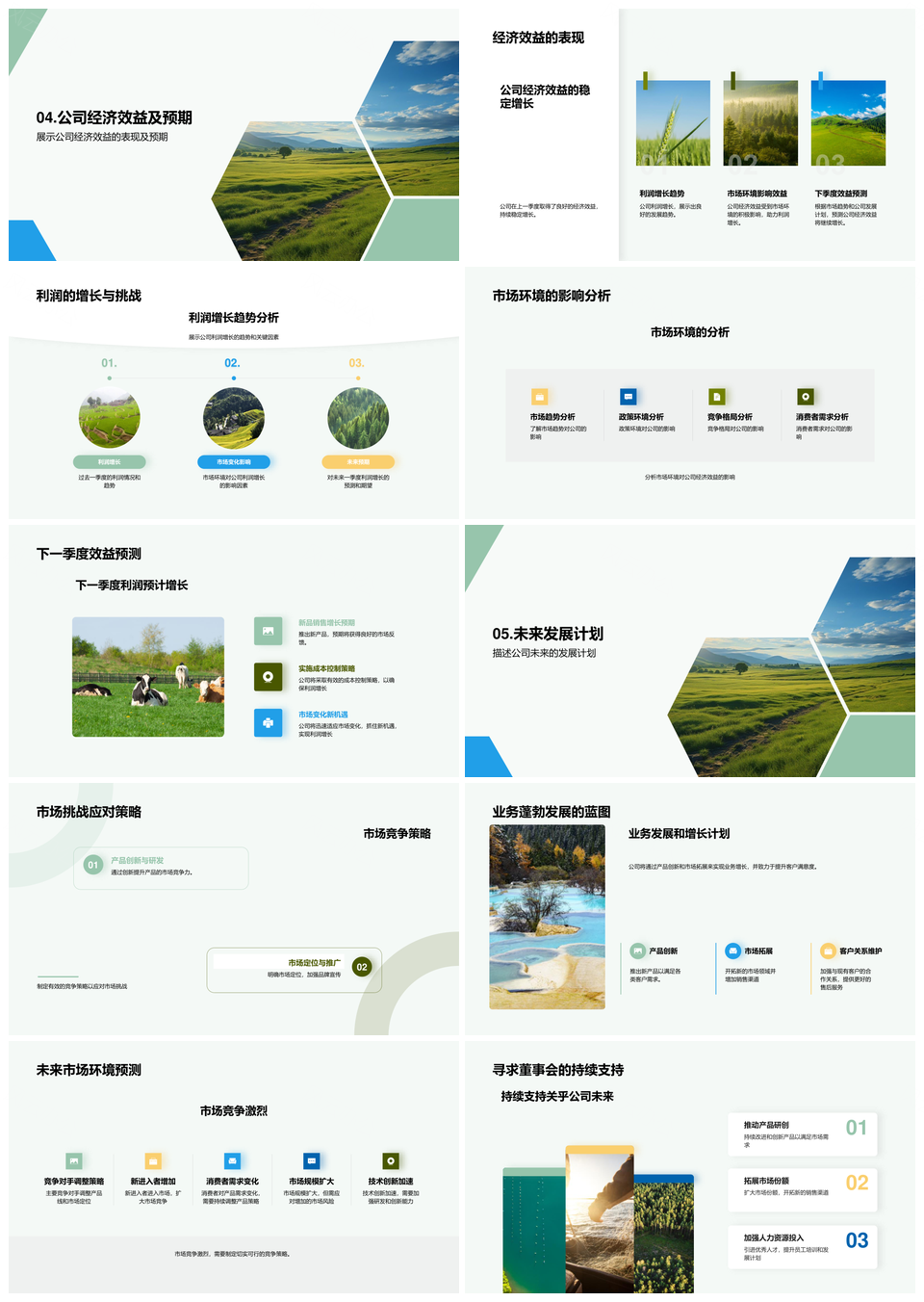 本模板以自然景观与科技发展为设计灵感,采用绿、蓝、白三色构建视觉基调,六边形模块化结构提升信息承载力。封面融合草地、山脉、日落的渐变层次,内页以天空意象搭配激光数据图例,实现自然元素与行业分析的理性结合。双栏排版支持农业数据与财务预测的并行展示,波粒二象性概念图解可辅助阐释发展模式中的矛盾统一。图表区采用分层投影设计,确保牧场规模、营收曲线的多维数据清晰呈现,内容层级通过几何明度差异自然区分。模板支持畜牧产业报告、企业财务规划、科研趋势推演等专业场景,兼顾实证分析与前瞻视野的表达需求。