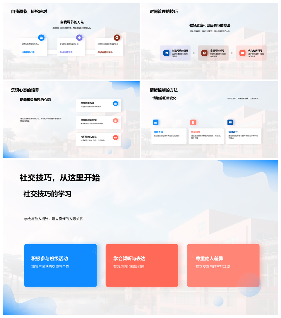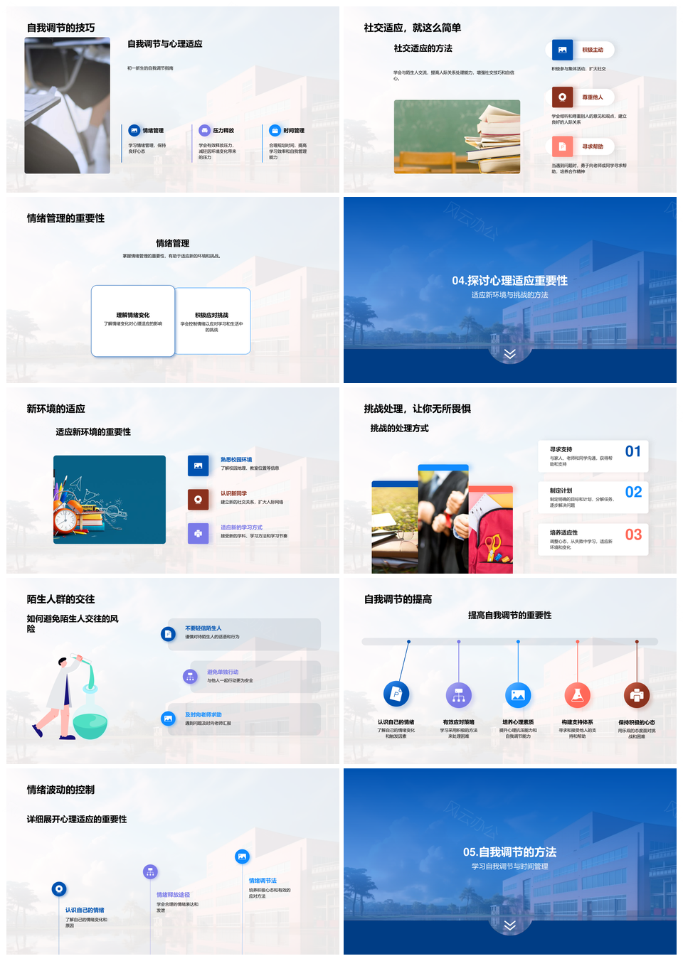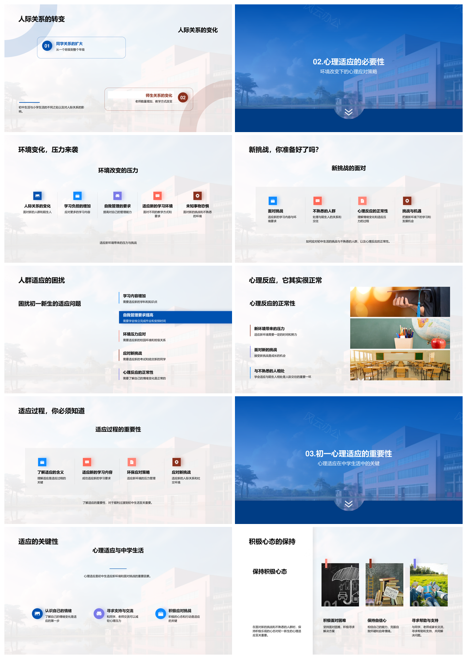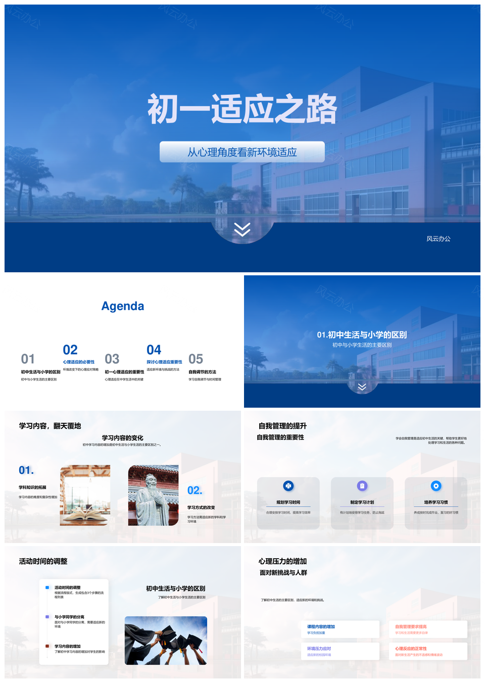 风云办公提供的初一新生心理适应新环境自我管理PPT模板,下载格式为pptx,一共33页,作品中文字及图均可以修改和编辑,图片更改请在作品中右键图片并更换,文字修改请直接点击文字进行修改。