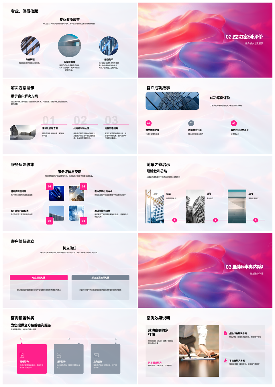 这是一张咨询服务成效案例团队实力方案流程解析PPT模板,包含咨询服务、成效、案例、团队、实力、方案、流程、解析等主题内容,也可用作咨询服务成效案例团队实力、成效案例团队实力方案、案例团队实力方案流程、团队实力方案流程解析、成效案例团队实力、案例团队实力方案、团队实力方案流程、方案流程解析、案例方案流程、咨询服务成效、成效案例、案例团队实力、团队实力方案、方案流程、流程解析等PPT场景使用。 风云办公提供的咨询服务成效案例团队实力方案流程解析PPT模板,下载格式为pptx,一共33页,作品中文字及图均可以修改和编辑,图片更改请在作品中右键图片并更换,文字修改请直接点击文字进行修改。
