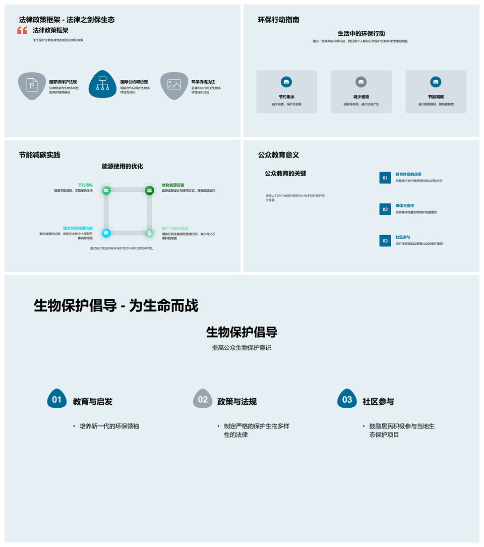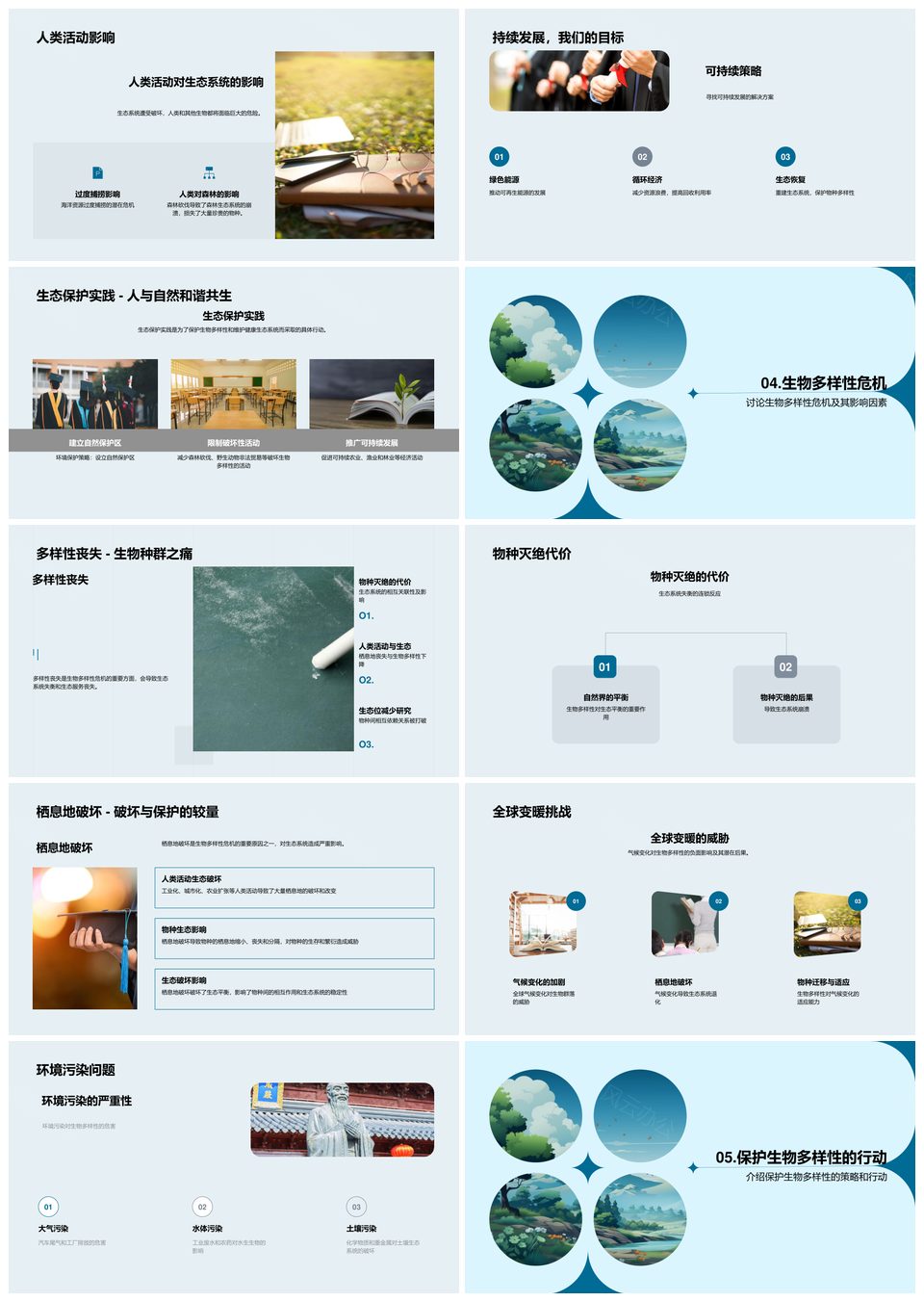 这是一张生物多样性保护人类活动与生态系统维护PPT模板,包含生物多样性、保护、人类活动、生态系统、维护等主题内容,也可用作生物多样性保护人类活动生态系统、保护人类活动生态系统维护、生物多样性保护生态系统维护、生物多样性保护人类活动、保护人类活动生态系统、人类活动生态系统维护、生物多样性保护生态系统、保护生态系统维护、生态系统维护生物多样性、生物多样性保护、生态系统维护、保护人类活动、维护生物多样性、保护生态系统、人类活动生态系统等PPT场景使用。 风云办公提供的生物多样性保护人类活动与生态系统维护PPT模板,下载格式为pptx,一共33页,作品中文字及图均可以修改和编辑,图片更改请在作品中右键图片并更换,文字修改请直接点击文字进行修改。
