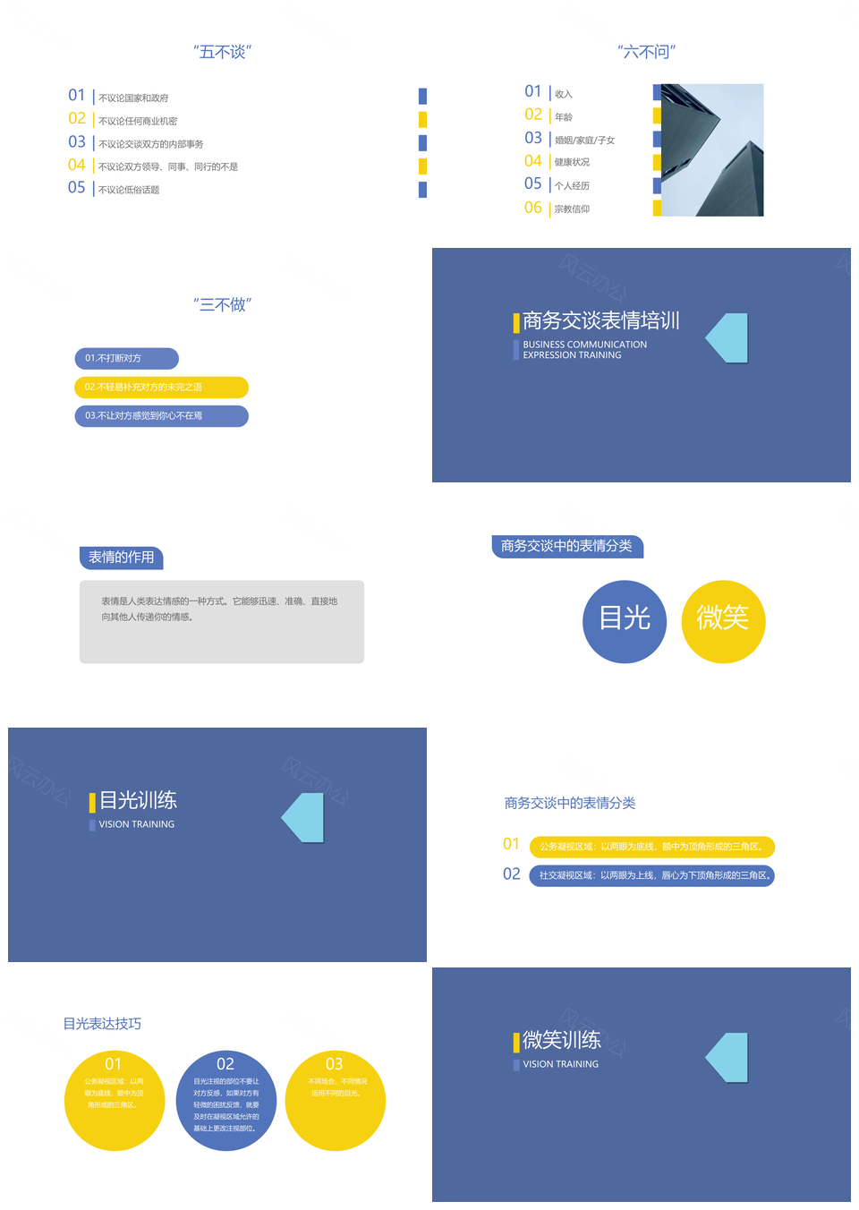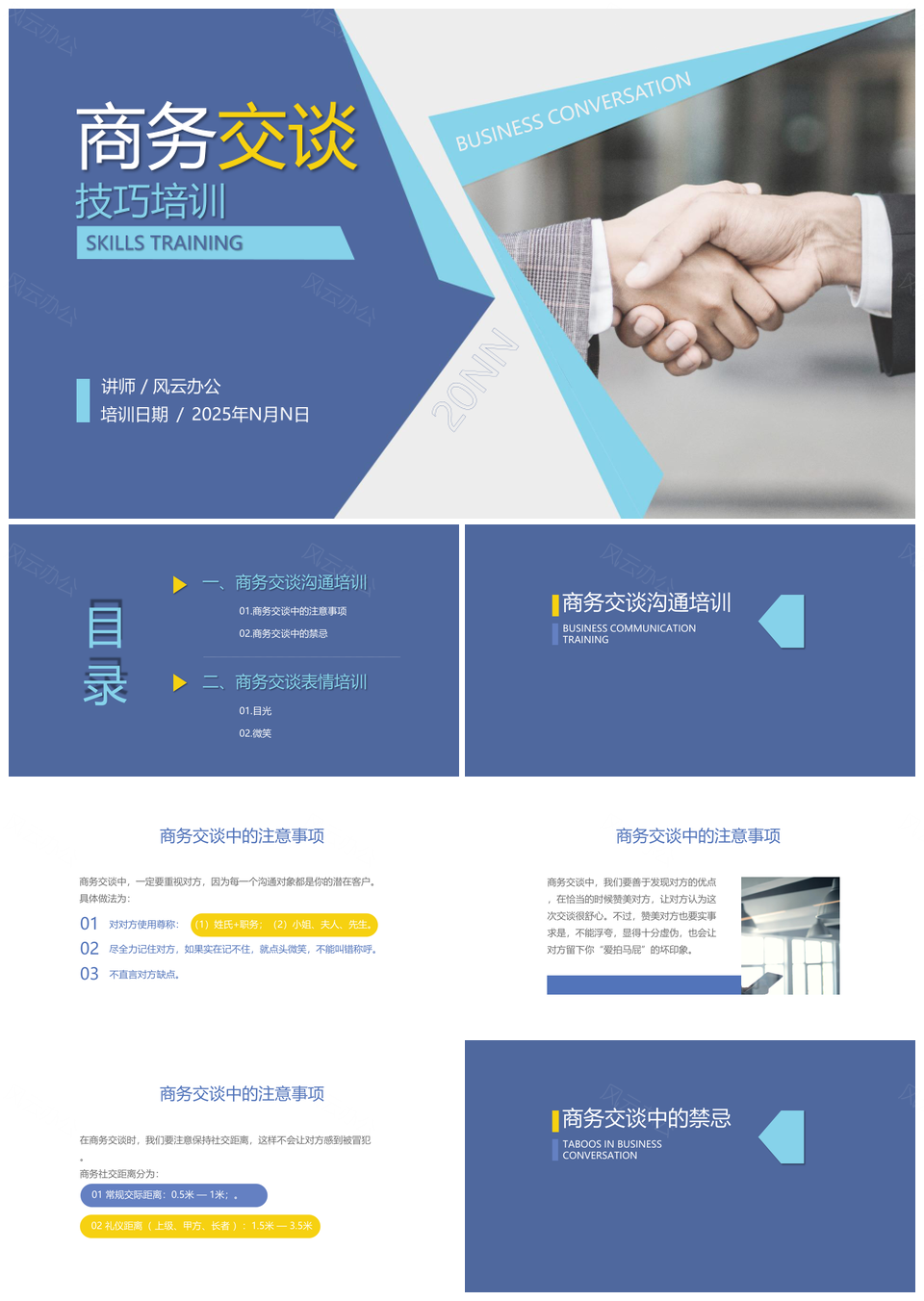 风云办公提供的2025蓝色商务礼仪沟通交流PPT模板,下载格式为pptx,一共18页,作品中文字及图均可以修改和编辑,图片更改请在作品中右键图片并更换,文字修改请直接点击文字进行修改。