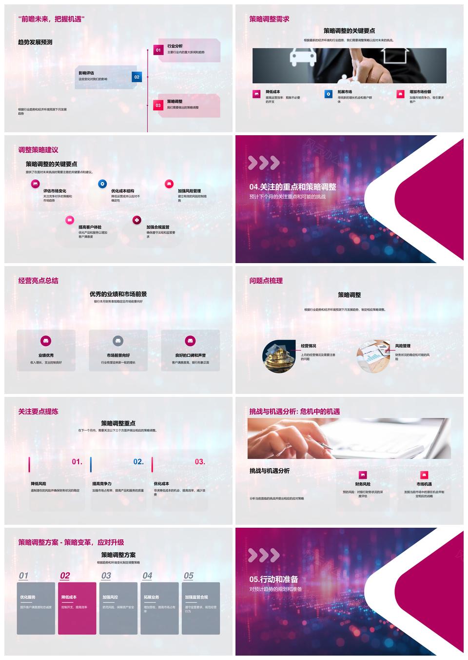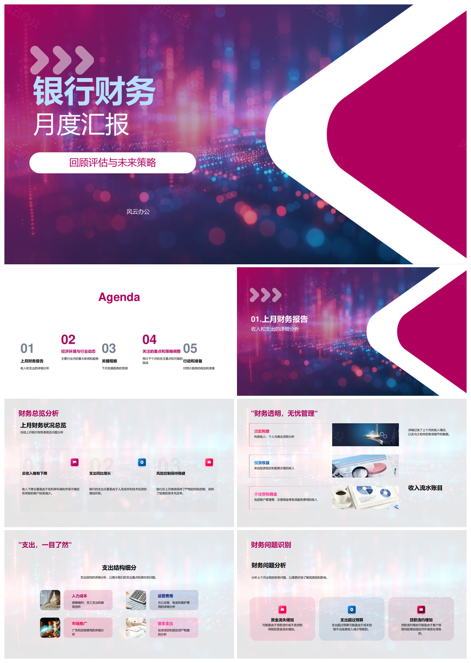 这是一张银行财务月度汇报问题策略调整行业趋势风险分析PPT模板,包含银行、财务、月度汇报、问题、策略调整、行业趋势、风险分析等主题内容,也可用作银行财务月度汇报、银行财务策略调整、月度汇报问题策略、策略调整行业趋势、行业趋势风险分析、财务月度汇报问题、银行财务问题、月度汇报问题、问题策略调整、调整行业趋势、行业趋势风险、趋势风险分析、策略调整分析、银行财务、风险分析等PPT场景使用。 风云办公提供的银行财务月度汇报问题策略调整行业趋势风险分析PPT模板,下载格式为pptx,一共33页,作品中文字及图均可以修改和编辑,图片更改请在作品中右键图片并更换,文字修改请直接点击文字进行修改。