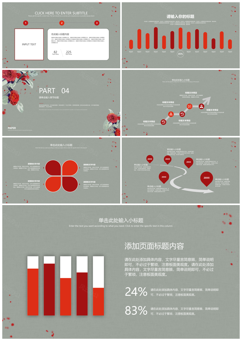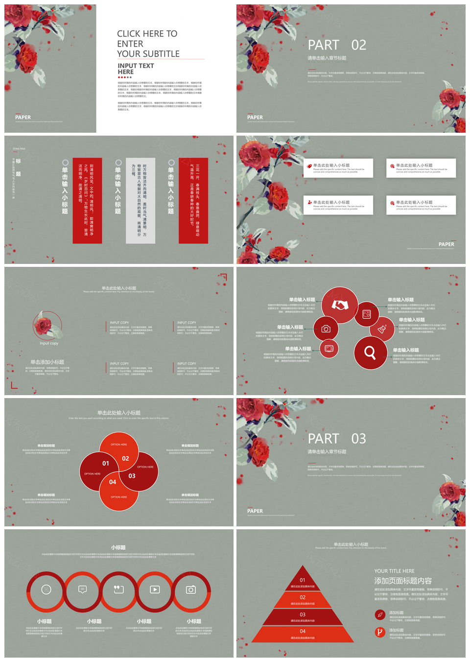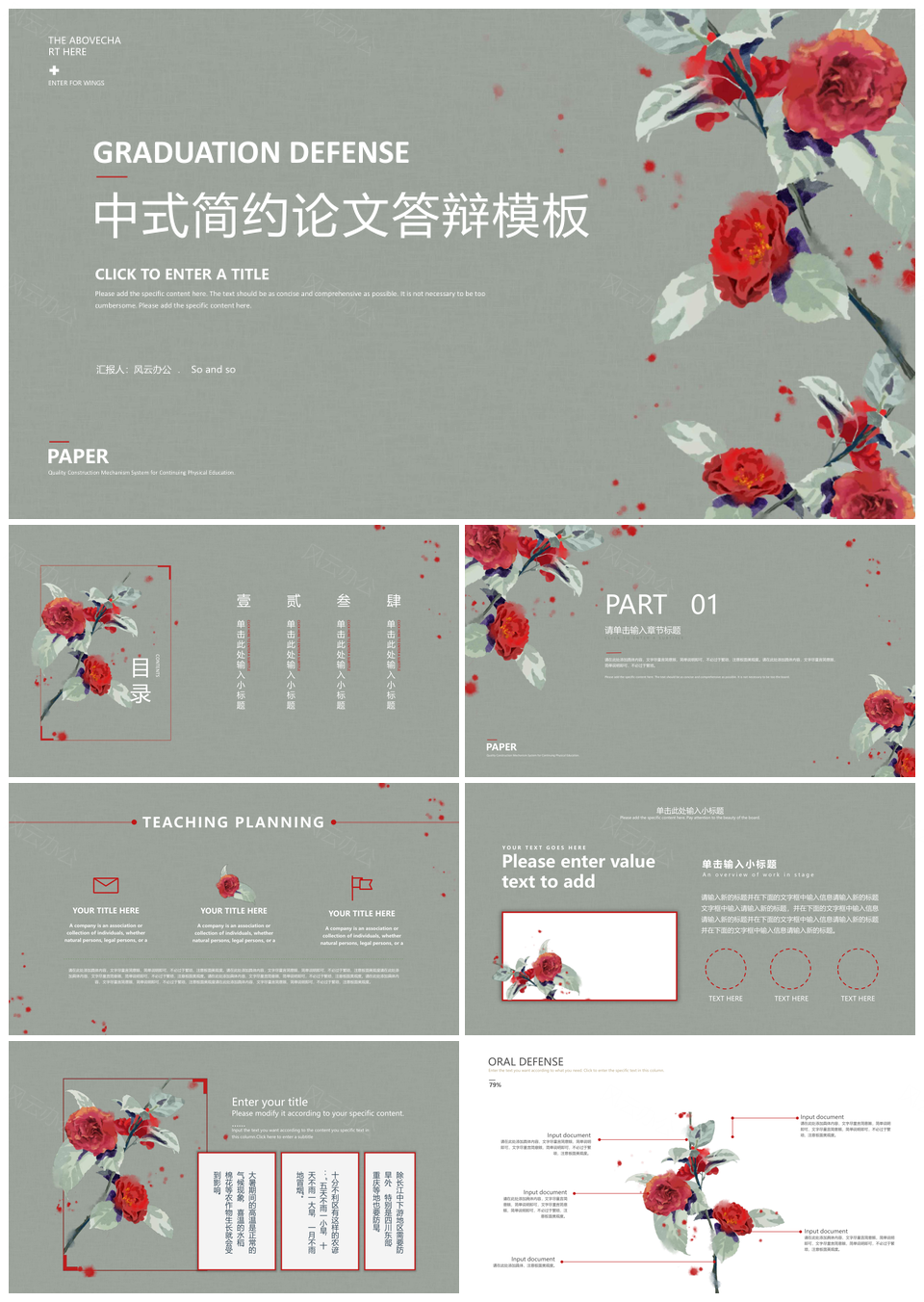 这款模板以深灰背景打造沉稳基调,弱化视觉干扰,适配学术报告、科技分享等场景。中式元素通过留白构图与暗纹肌理自然融入,左侧点缀单枝红色工笔花朵,既打破冷色调的严肃感,又延续东方美学;科学模块选用激光光束、波粒二象性分形图案,搭配可替换的简约矢量图标,逻辑关系通过递进式文本排版清晰呈现。页脚设有隐藏式导航标识,另含12组数据图表模板,采用深浅灰阶过渡,确保内容聚焦,严谨的版式逻辑为深层次信息传递提供结构化支持。