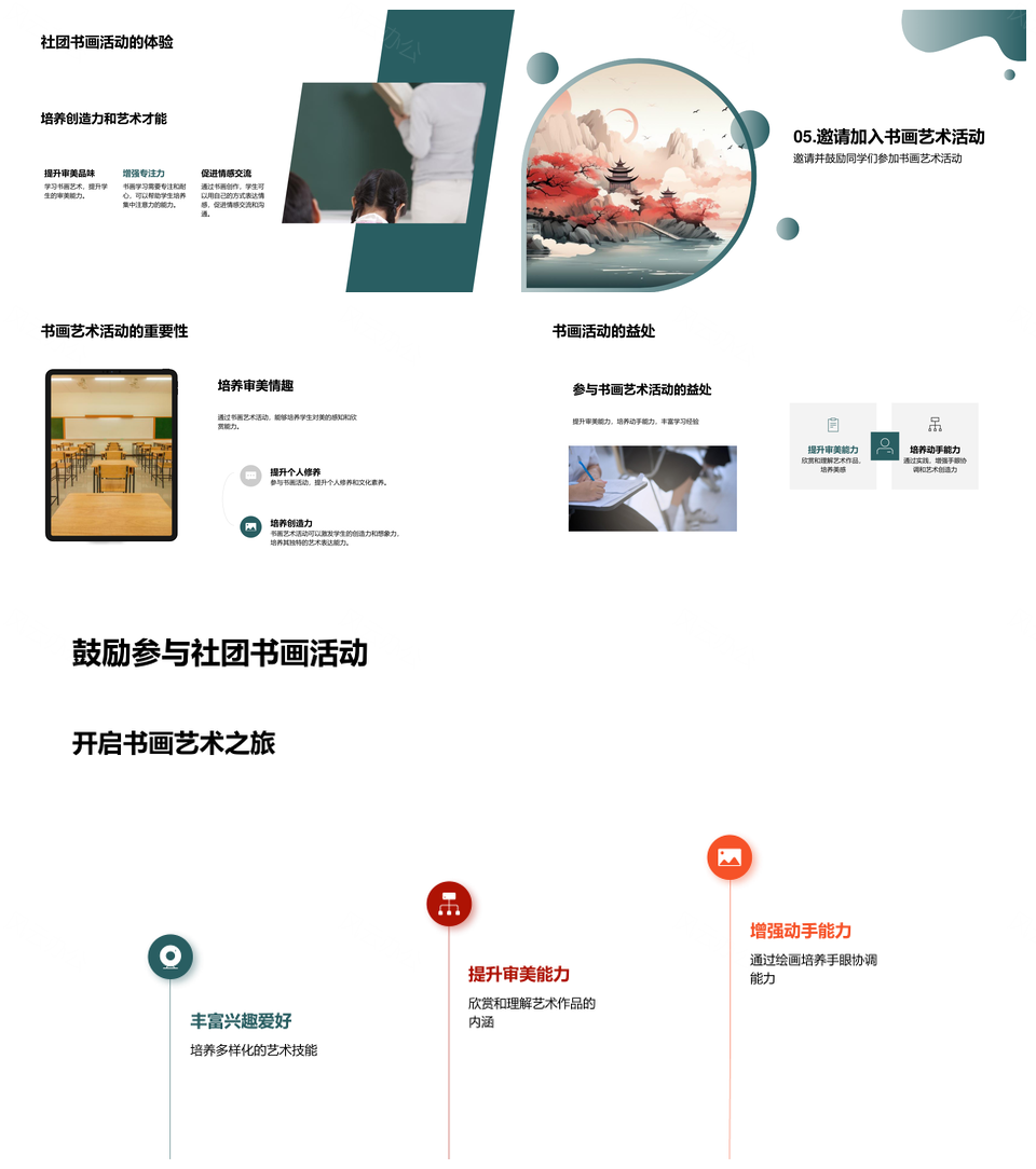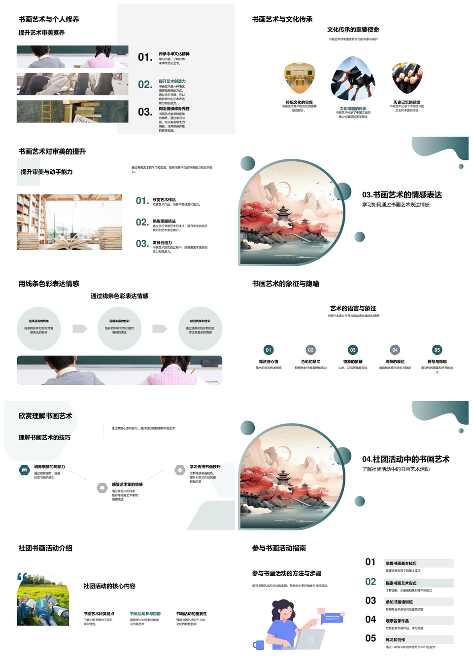 风云办公提供的书画社团传承历史艺术修养与情感PPT模板,下载格式为pptx,一共23页,作品中文字及图均可以修改和编辑,图片更改请在作品中右键图片并更换,文字修改请直接点击文字进行修改。