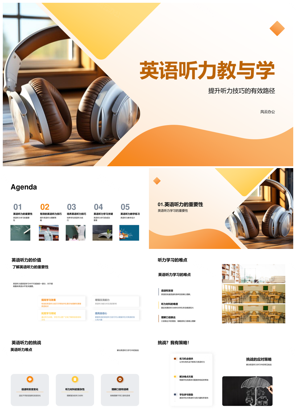 风云办公提供的初三师生英语听力教与学技巧提升关键PPT模板,下载格式为pptx,一共33页,作品中文字及图均可以修改和编辑,图片更改请在作品中右键图片并更换,文字修改请直接点击文字进行修改。