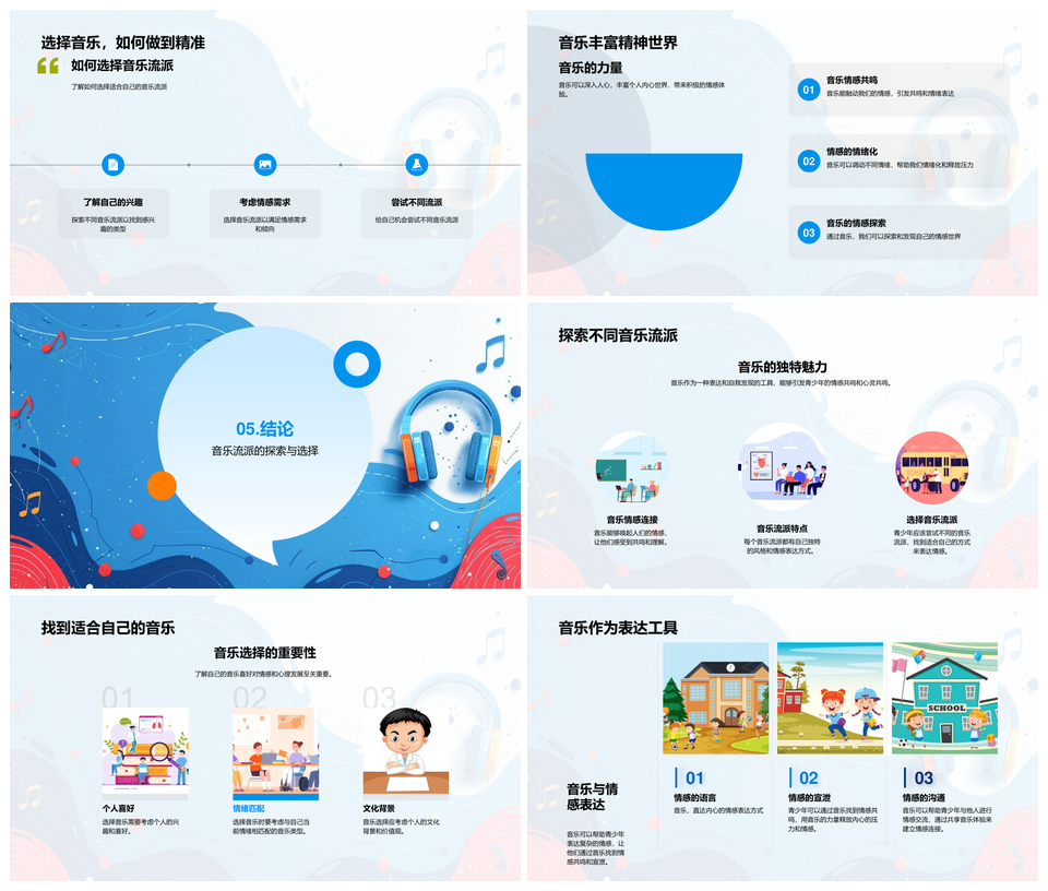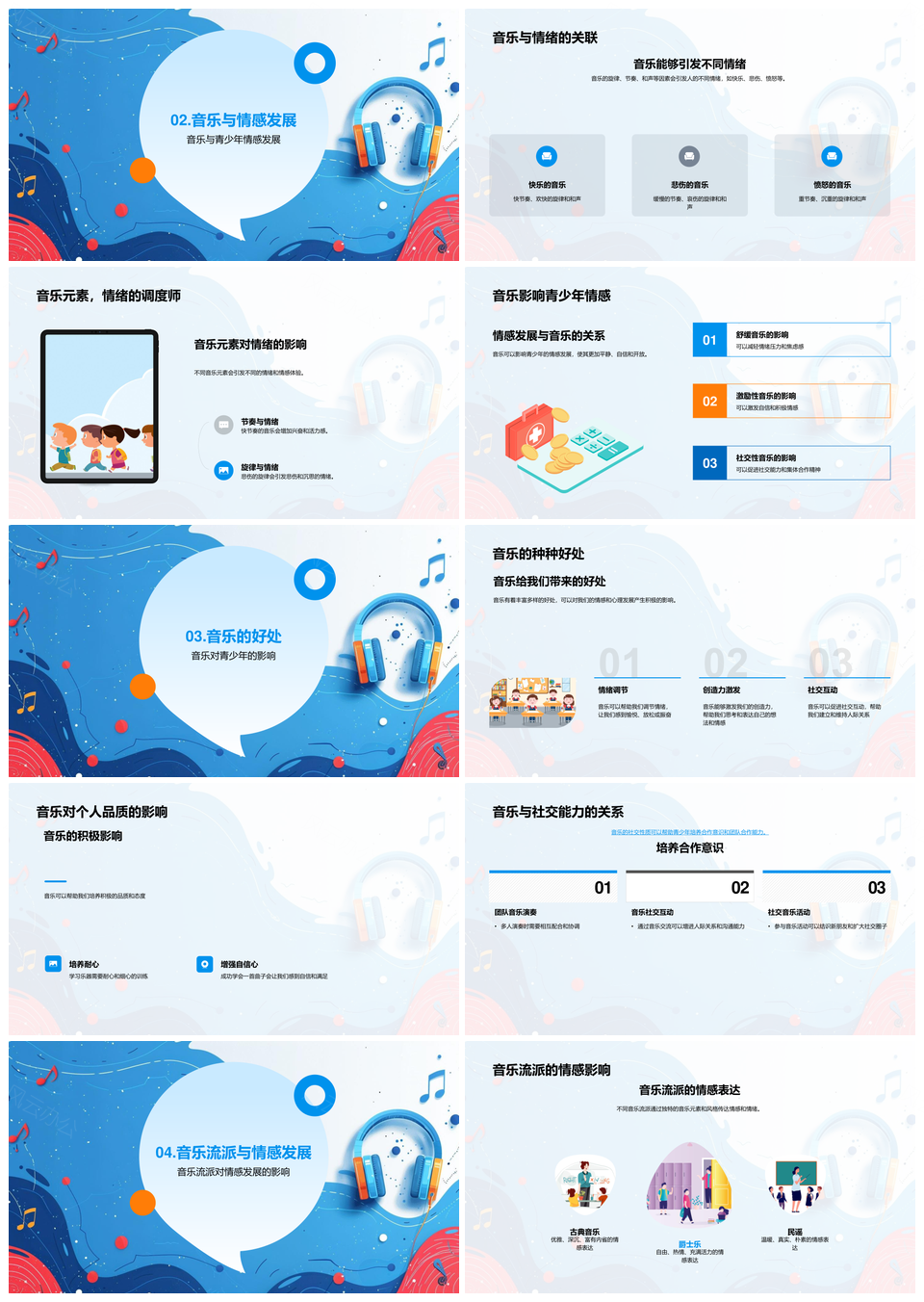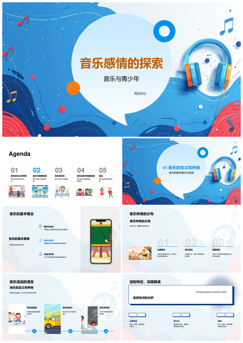 风云办公提供的音乐教育流派影响青少年情感智慧社交PPT模板,下载格式为pptx,一共24页,作品中文字及图均可以修改和编辑,图片更改请在作品中右键图片并更换,文字修改请直接点击文字进行修改。