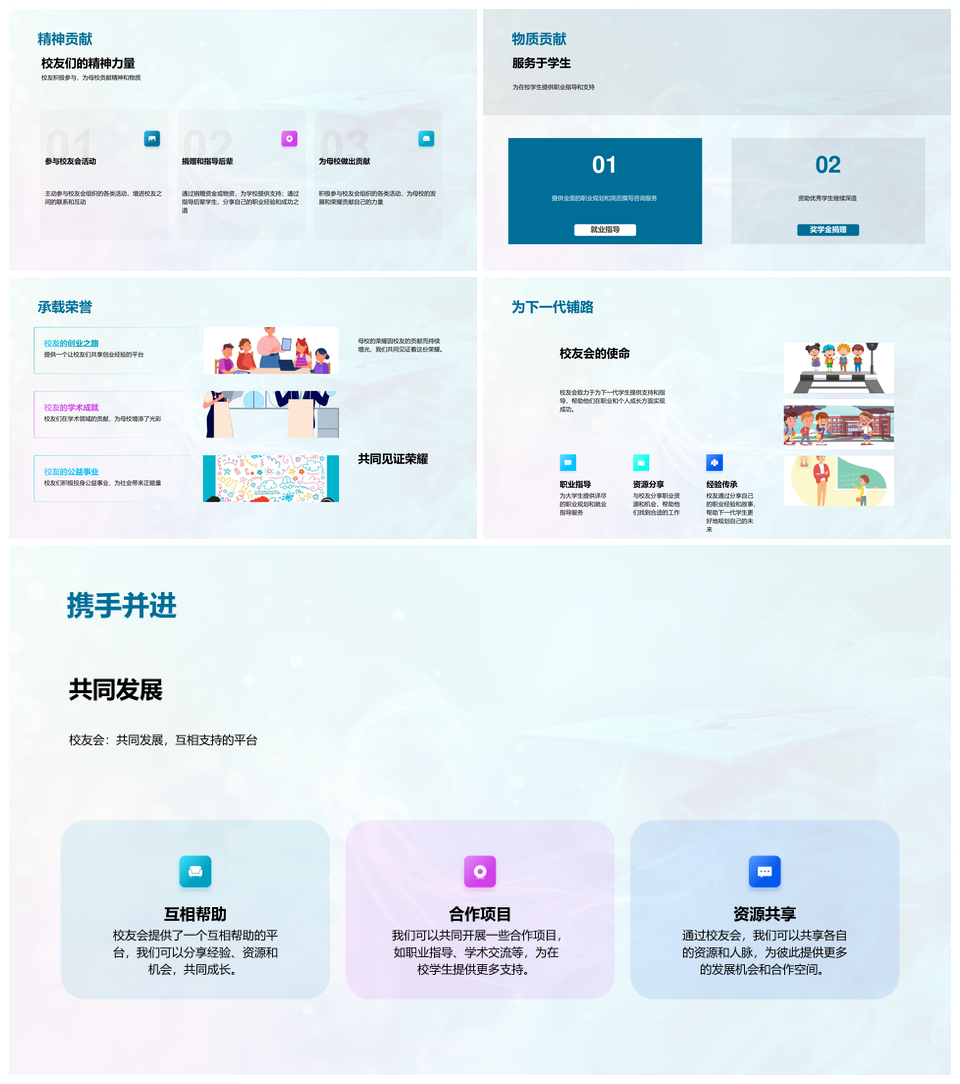 这是一张校友聚力共筑母校荣光PPT模板,包含校友、聚力、共筑、母校、荣光等主题内容,也可用作校友聚力共筑母校、聚力共筑母校荣光、校友聚力共筑、聚力共筑母校、共筑母校荣光、聚力共筑荣光、校友母校荣光、校友共筑荣光、校友聚力、聚力共筑、共筑母校、母校荣光、校友共筑、校友荣光、共筑荣光等PPT场景使用。 风云办公提供的校友聚力共筑母校荣光PPT模板,下载格式为pptx,一共33页,作品中文字及图均可以修改和编辑,图片更改请在作品中右键图片并更换,文字修改请直接点击文字进行修改。