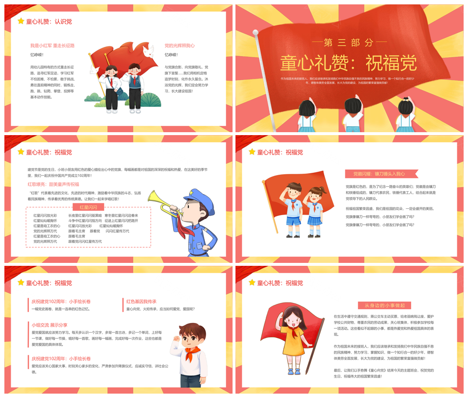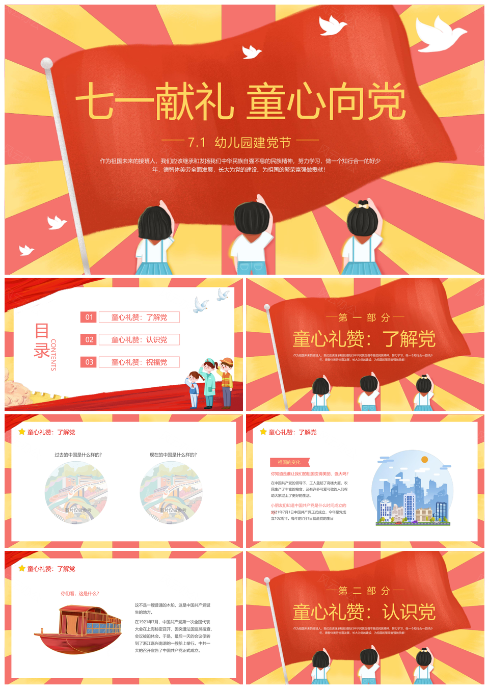 这是一张红黄卡通幼儿园建党节党建动态PPT设计,包含红黄、卡通、幼儿园、建党节、党建、设计等主题内容,也可用作红黄卡通幼儿园建党节、卡通幼儿园建党节党建、幼儿园建党节党建动态、建党节党建动态PPT、党建动态PPT设计、红黄卡通幼儿园、卡通幼儿园建党节、幼儿园建党节党建、建党节党建动态、党建动态PPT、动态PPT设计、红黄幼儿园建党节、建党节PPT设计、党建PPT设计、红黄卡通等PPT场景使用。