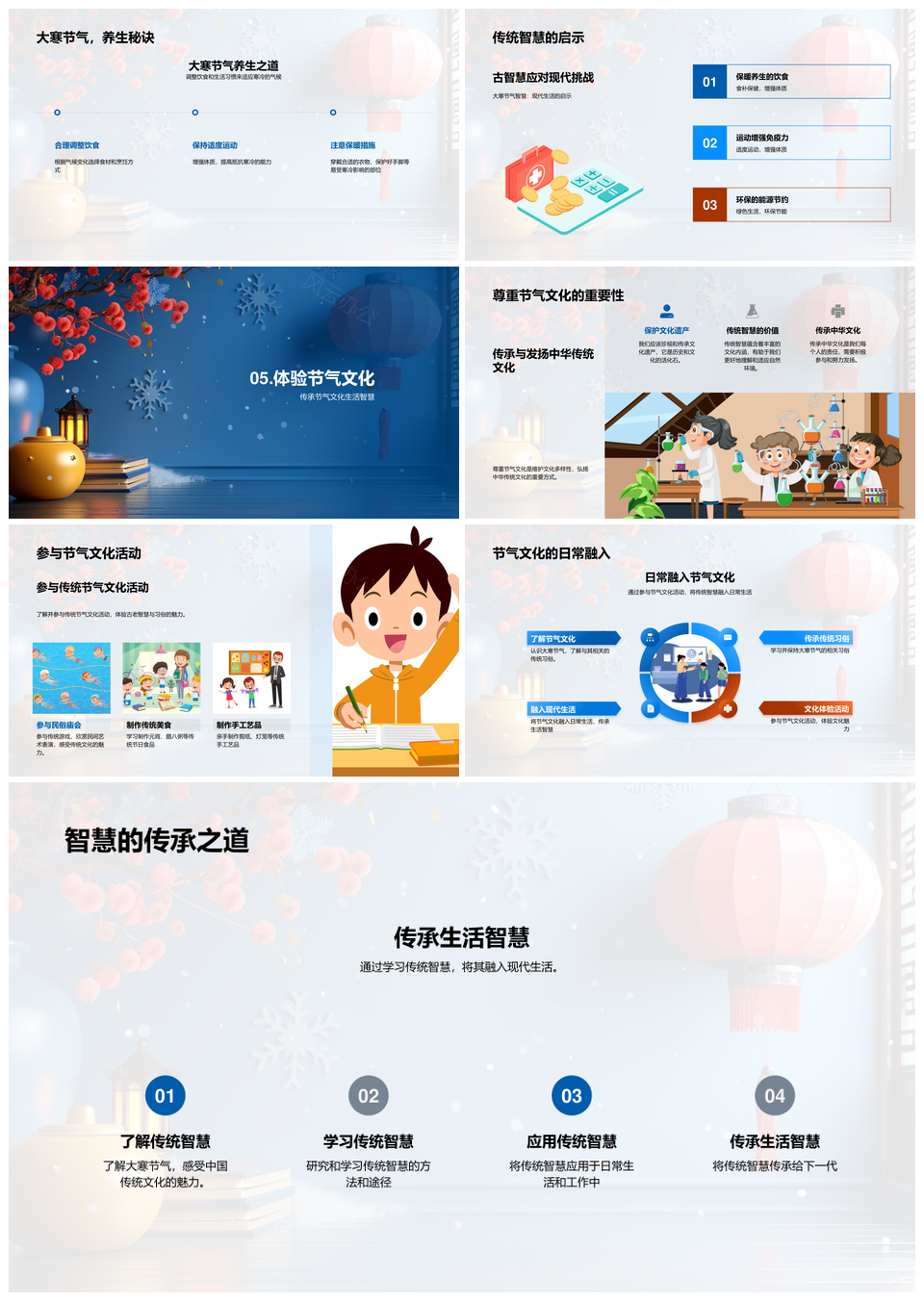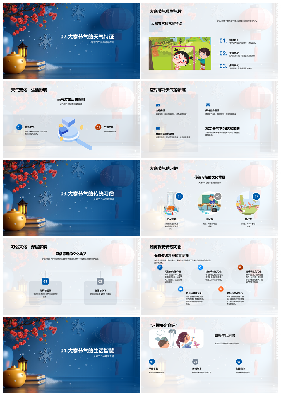 这是一张大寒节气传统习俗养生之道与季节转变解析PPT模板,包含大寒节气、传统习俗、养生之道、季节转变、解析等主题内容,也可用作大寒节气传统习俗养生之道、大寒节气传统习俗养生、大寒节气传统习俗、大寒节气传统、节气传统习俗养生之道、节气传统习俗养生、节气传统习俗、节气传统、传统习俗养生之道季节、传统习俗养生季节、传统习俗养生、传统习俗、习俗养生之道季节转变、习俗养生季节转变、习俗养生季节等PPT场景使用。 风云办公提供的大寒节气传统习俗养生之道与季节转变解析PPT模板,下载格式为pptx,一共25页,作品中文字及图均可以修改和编辑,图片更改请在作品中右键图片并更换,文字修改请直接点击文字进行修改。
