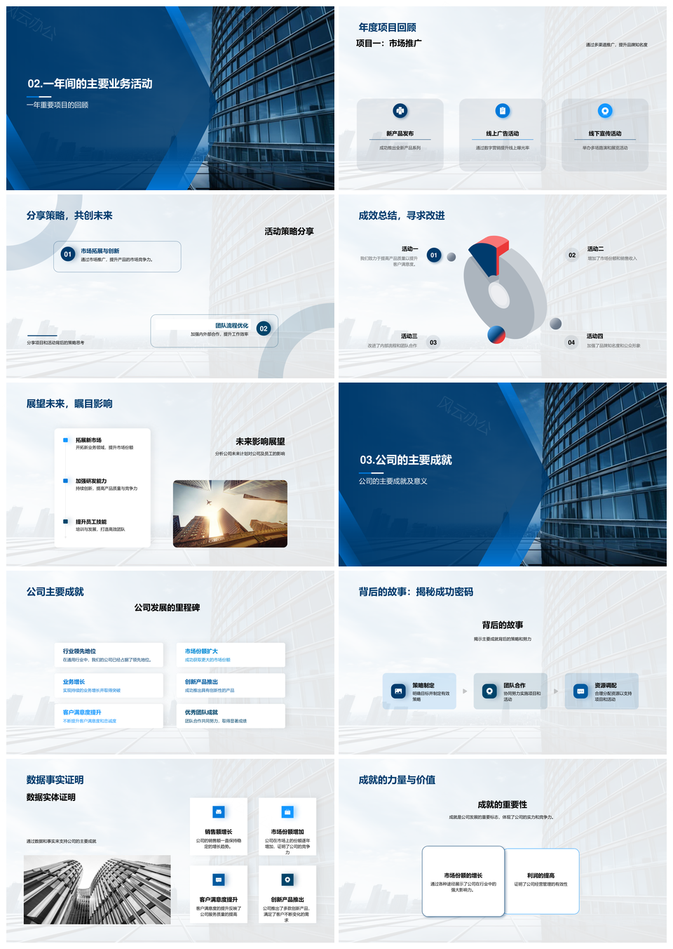 这是一张公司年度成就奋进摩天战略筑梦未来蓝图PPT模板,包含年度、成就、奋进、摩天、战略、筑梦、未来、蓝图等主题内容,也可用作公司年度成就奋进摩天战略、年度成就奋进摩天战略、成就奋进摩天战略筑梦、奋进摩天战略筑梦未来、摩天战略筑梦未来蓝图、战略筑梦未来蓝图、公司年度成就奋进、年度成就奋进摩天、成就奋进摩天战略、奋进摩天战略筑梦、摩天战略筑梦未来、战略筑梦未来蓝图、公司年度成就、年度成就奋进、摩天战略筑梦等PPT场景使用。 风云办公提供的公司年度成就奋进摩天战略筑梦未来蓝图PPT模板,下载格式为pptx,一共29页,作品中文字及图均可以修改和编辑,图片更改请在作品中右键图片并更换,文字修改请直接点击文字进行修改。