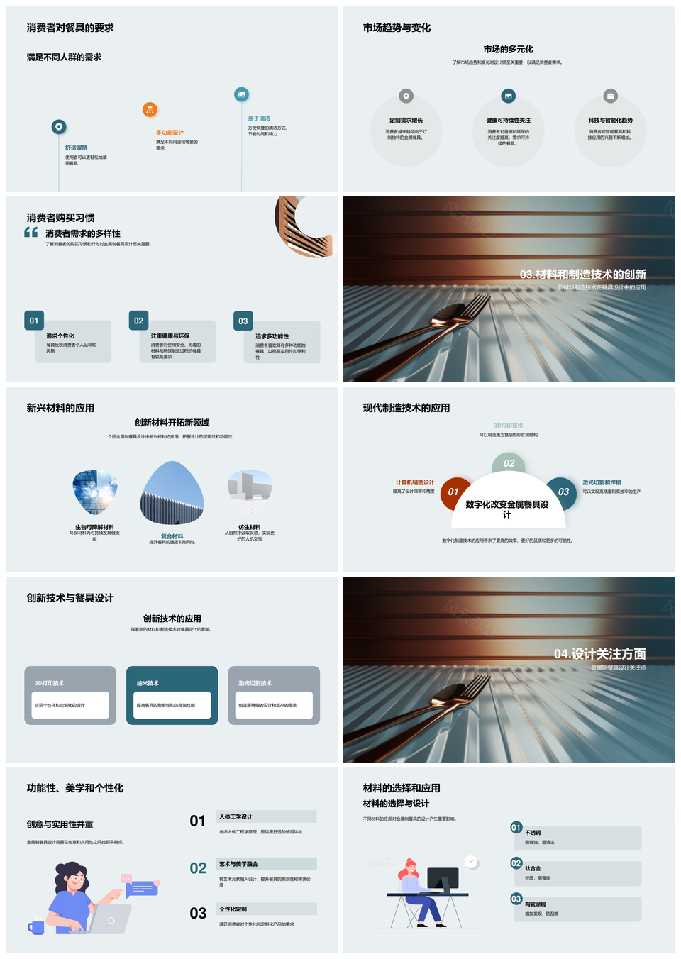 这是一张2025金属餐具创新设计与消费文化趋势PPT模板,包含2025、金属餐具、创新设计、消费文化、趋势等主题内容,也可用作2025金属餐具创新设计、金属餐具创新设计消费文化、金属餐具消费文化趋势、创新设计消费文化趋势、2025金属餐具消费文化、餐具创新设计消费文化、金属餐具创新设计趋势、2025消费文化趋势、金属消费文化趋势、餐具消费文化趋势、创新设计消费文化、消费文化趋势、金属餐具、创新设计、消费文化趋势等PPT场景使用。 风云办公提供的2025金属餐具创新设计与消费文化趋势PPT模板,下载格式为pptx,一共23页,作品中文字及图均可以修改和编辑,图片更改请在作品中右键图片并更换,文字修改请直接点击文字进行修改。