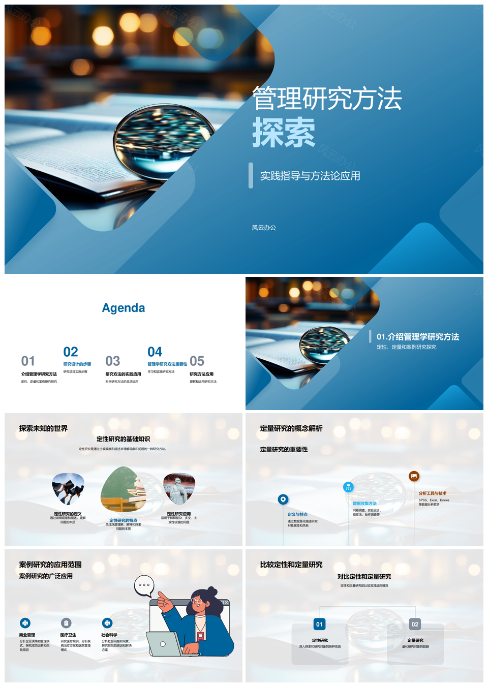 风云办公提供的管理研究定性定量案例设计分析实践PPT模板,下载格式为pptx,一共33页,作品中文字及图均可以修改和编辑,图片更改请在作品中右键图片并更换,文字修改请直接点击文字进行修改。