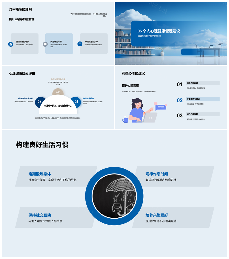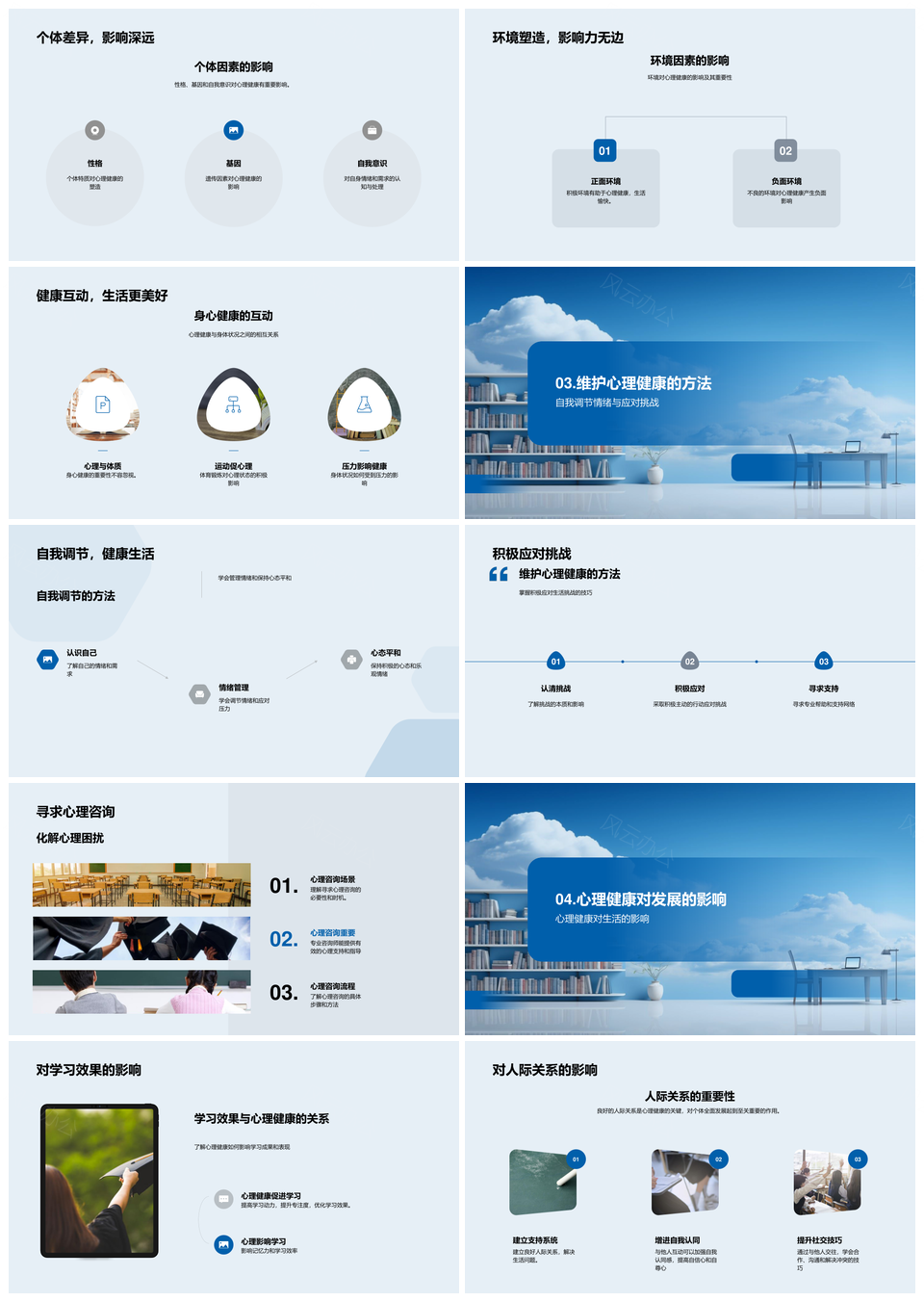 风云办公提供的心理健康维护个体环境身心互动调节PPT模板,下载格式为pptx,一共23页,作品中文字及图均可以修改和编辑,图片更改请在作品中右键图片并更换,文字修改请直接点击文字进行修改。