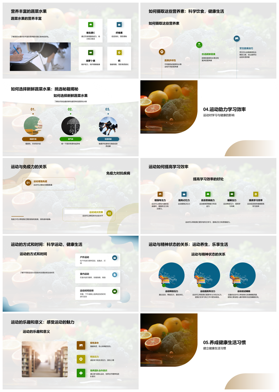 这是一张健康饮食运动蔬果营养强免疫增效率PPT模板,包含健康、饮食、运动、蔬果、营养、免疫、效率等主题内容,也可用作健康饮食运动蔬果、健康饮食蔬果营养、饮食运动蔬果营养、健康饮食运动营养、健康饮食营养免疫、健康运动蔬果营养、饮食运动营养免疫、健康饮食运动、健康饮食营养、健康饮食免疫、健康运动蔬果、饮食运动营养、运动蔬果营养、蔬果营养免疫、健康饮食等PPT场景使用。