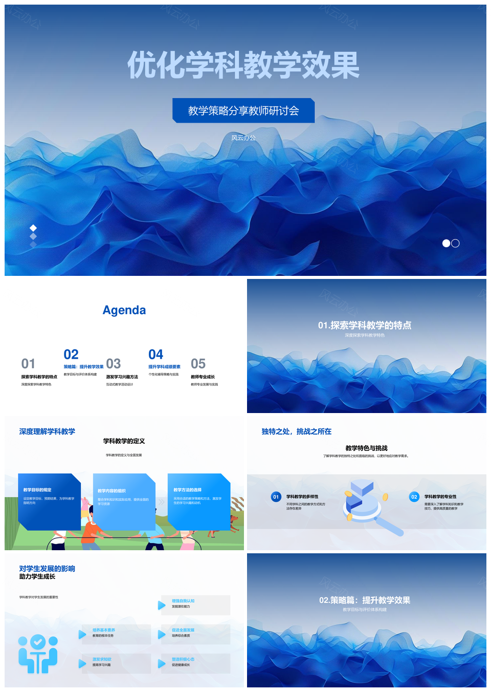 风云办公提供的教师研讨优化学科教学策略分享PPT模板,下载格式为pptx,一共23页,作品中文字及图均可以修改和编辑,图片更改请在作品中右键图片并更换,文字修改请直接点击文字进行修改。
